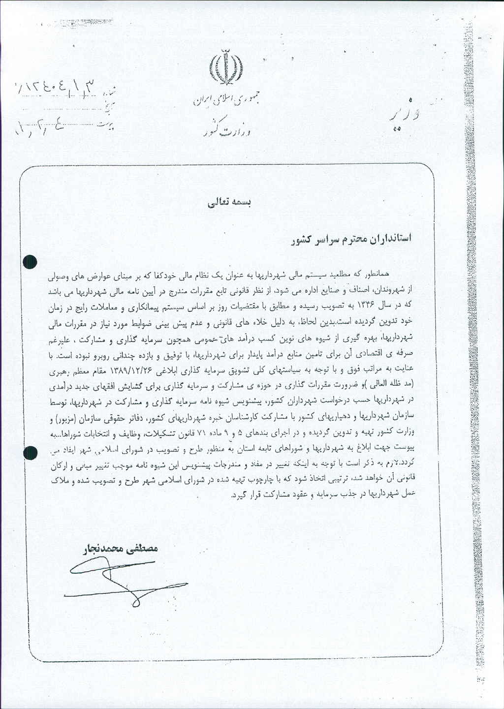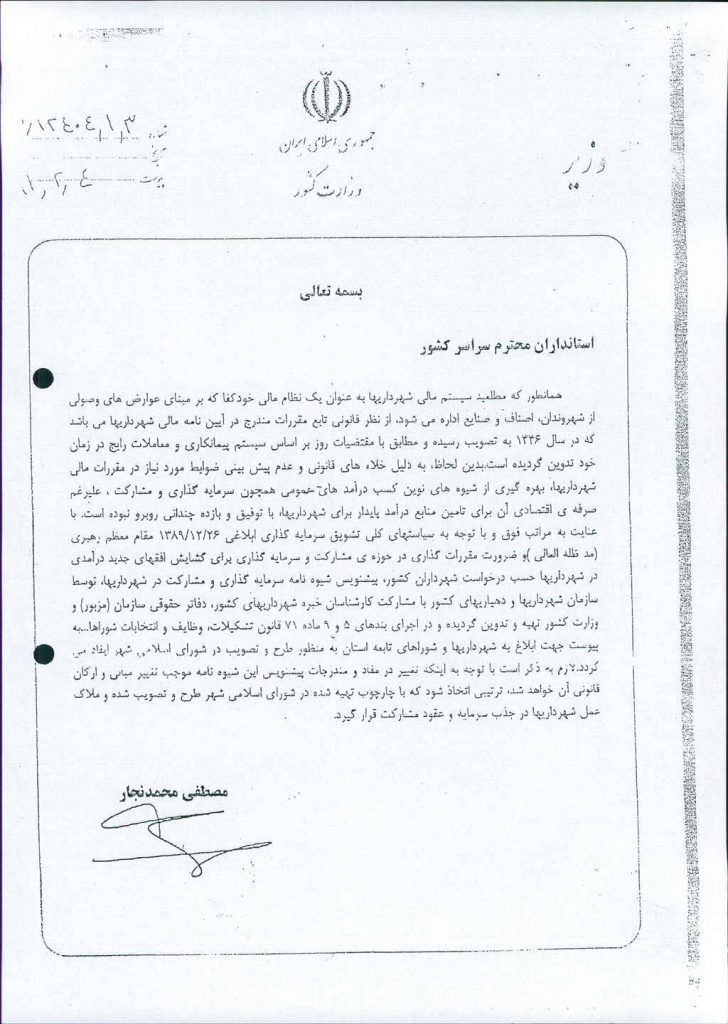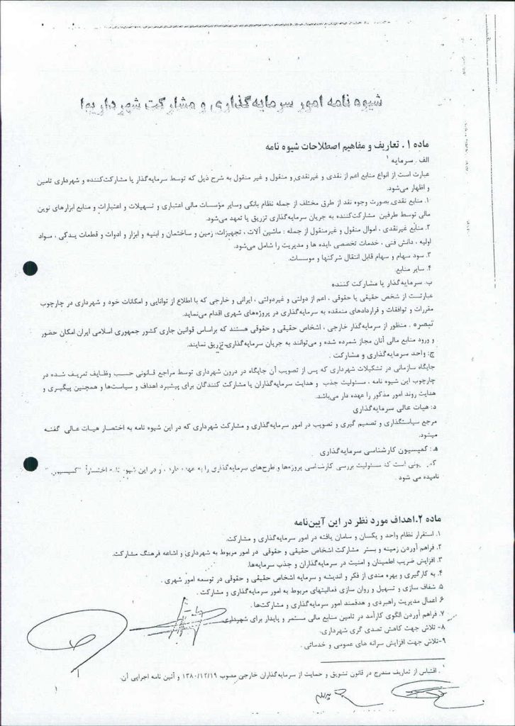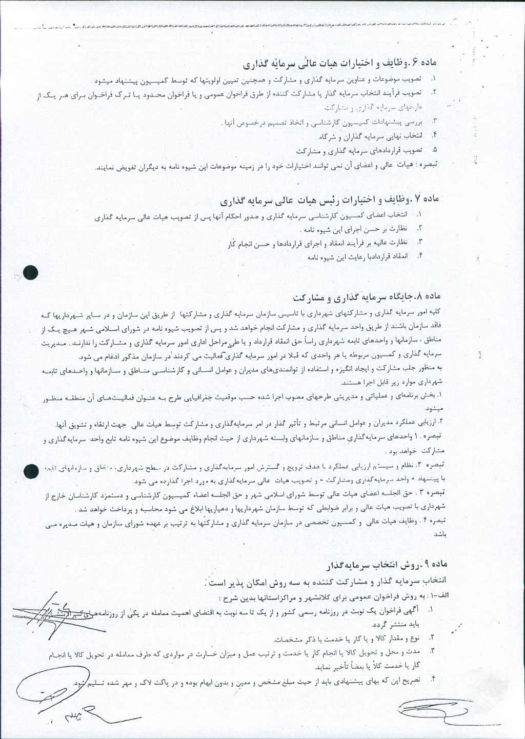نامه شماره فوق شهرداری در خصوص دستور العمل شیوه نامه امور سرمایه گذاری و مشارکت شهرداریها در جلسه مطرح و پس از بحث و بررسی با مجموع آراء ذیل مصوب گردید%