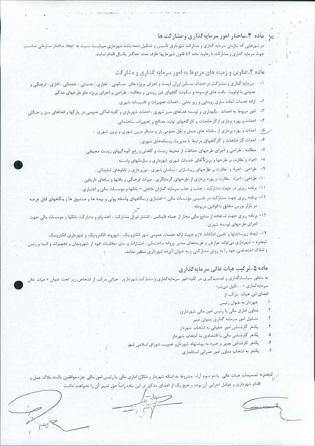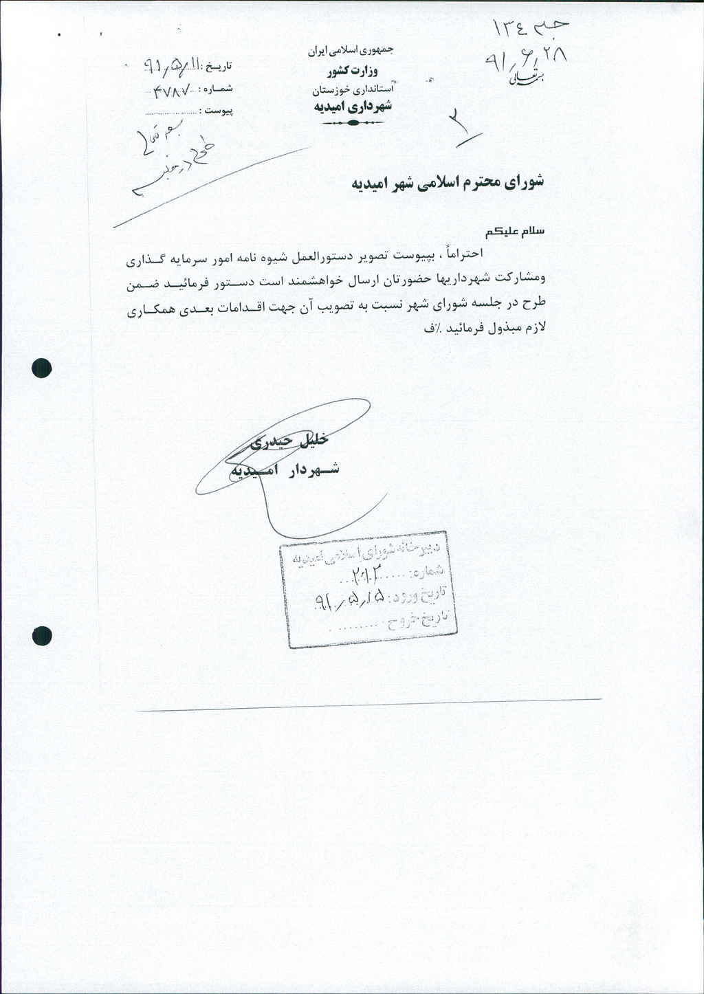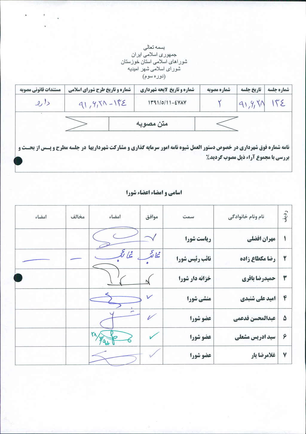 مصوبه شماره ۲ جلسه شماره ۱۳۴ مورخ ۹۱/۶/۲۸ شورای اسلامی شهر امیدیه