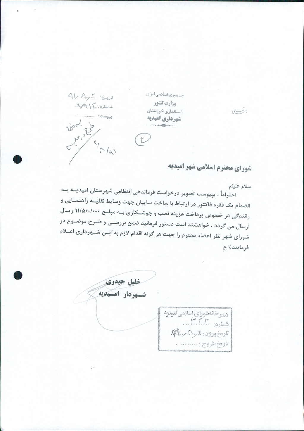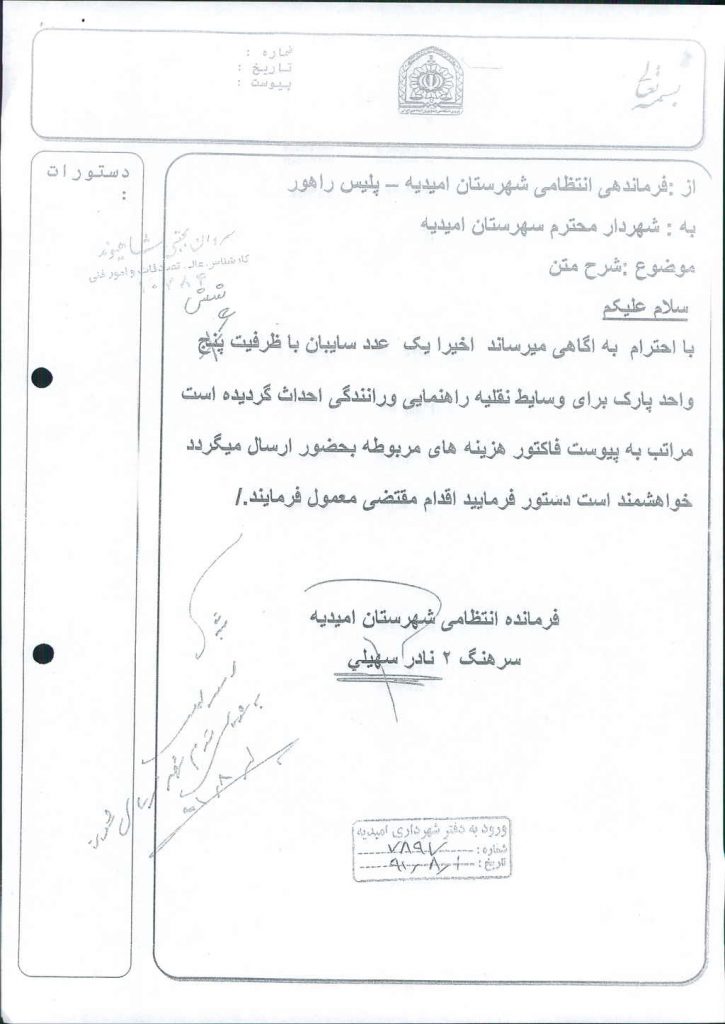 نامه شماره فوق مبنی بر اینکه شهرداری در نظر دارد بنابه درخواست فرماندهی نیروی انتظامی در ارتباط با ساخت سایبان جهت وسایط نقلیه راهنمایی و رانندگی در خصوص هزینه نصب و جوشکاری به مبلغ ۰۰۰/ ۵۰۰/ ۱۱ريال به نيروي انتظامي پرداخت  نمايد كه موضوع  در جلسه مطرح و پس از بحث و بررسی با مجموع آراء ذیل مصوب گردید%