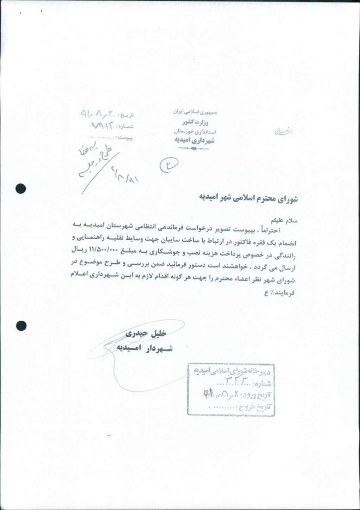 مصوبه شماره ۲ جلسه شماره ۱۳۸ مورخ ۹۱/۸/۹ شورای اسلامی شهر امیدیه