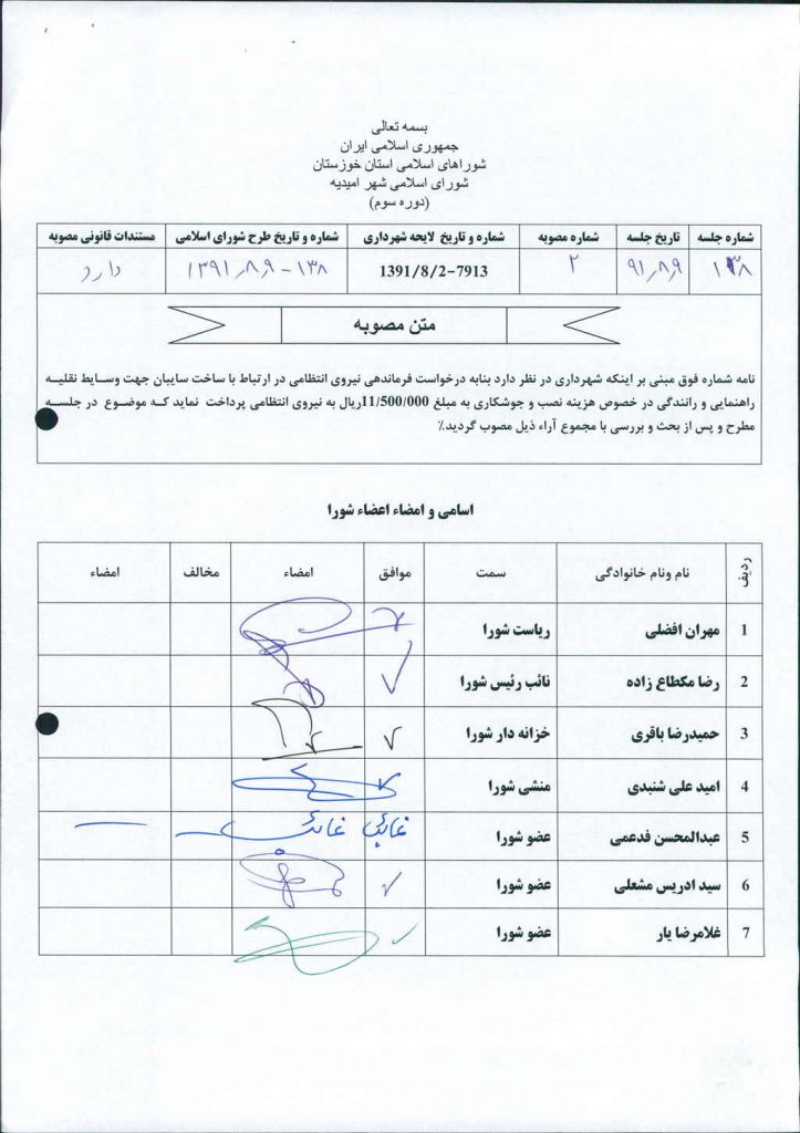 مصوبه شماره ۲ جلسه شماره ۱۳۸ شورای اسلامی شهر امیدیه