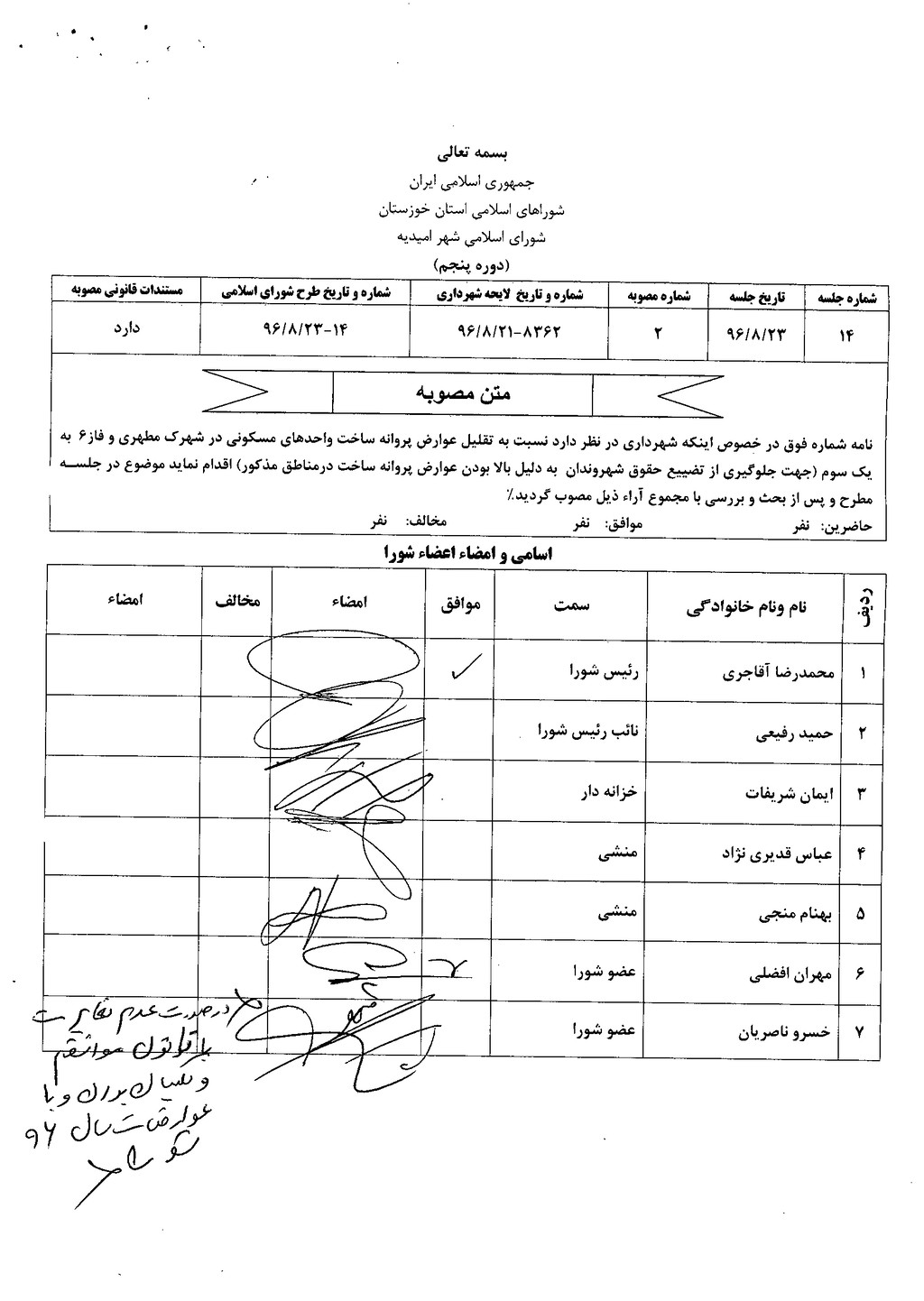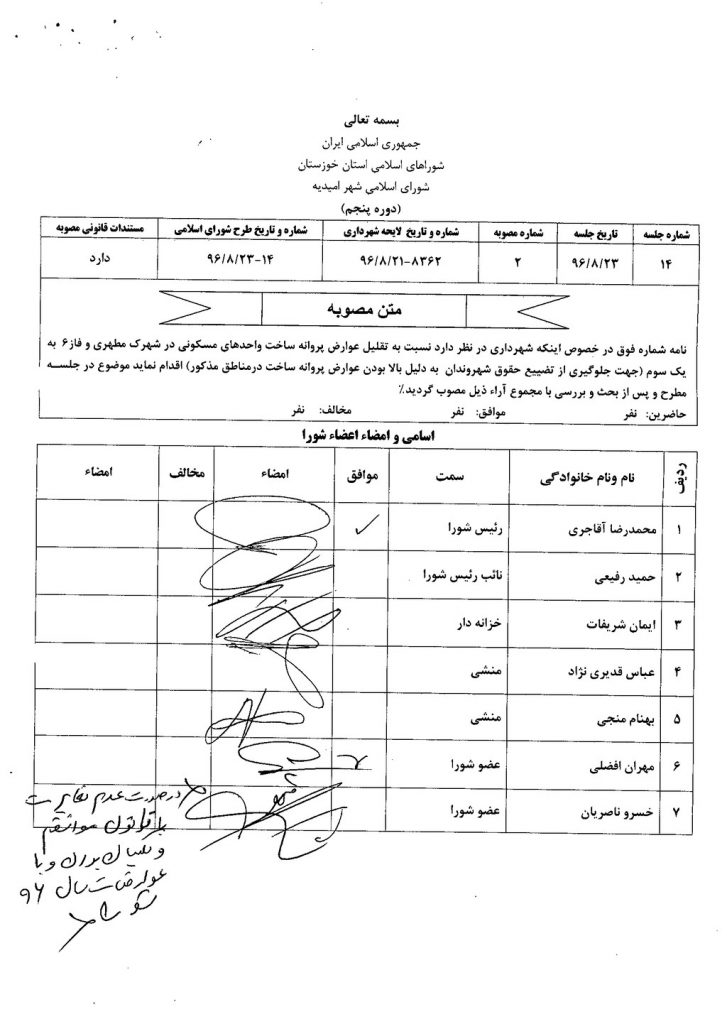 مصوبه شماره ۲ جلسه شماره ۱۴ شورای اسلامی شهر امیدیه