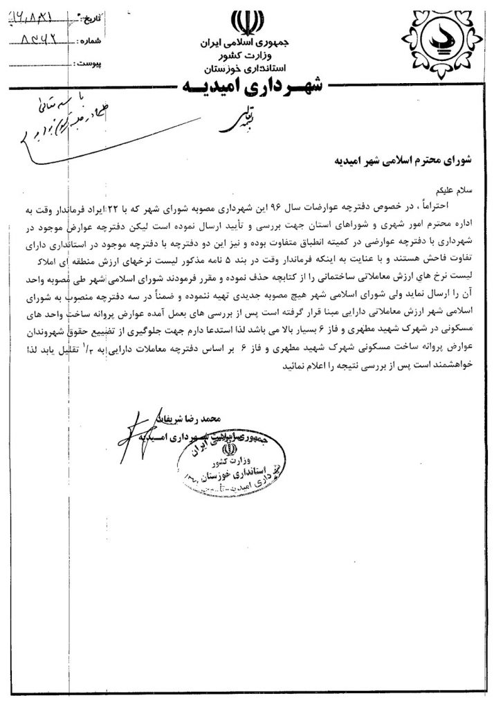 نامه شماره فوق در خصوص اینکه شهرداری در نظر دارد نسبت به تقلیل عوارض پروانه ساخت واحدهای مسکونی در شهرک مطهری و فاز۶ به یک سوم با توجه به دفترچه املاک دارایی (جهت جلوگیری از تضییع حقوق شهروندان به دلیل بالا بودن عوارض پروانه ساخت در مناطق مذکور) اقدام نماید موضوع در جلسه مطرح و پس از بحث و بررسی با مجموع آراء ذیل مصوب گردید%