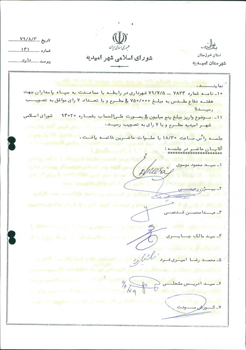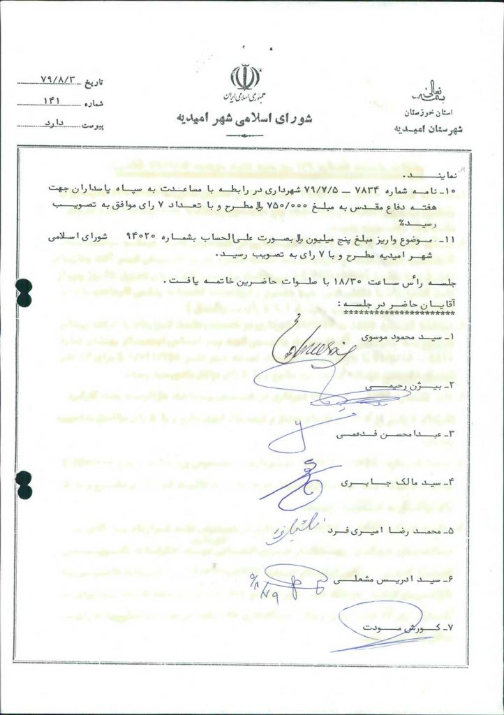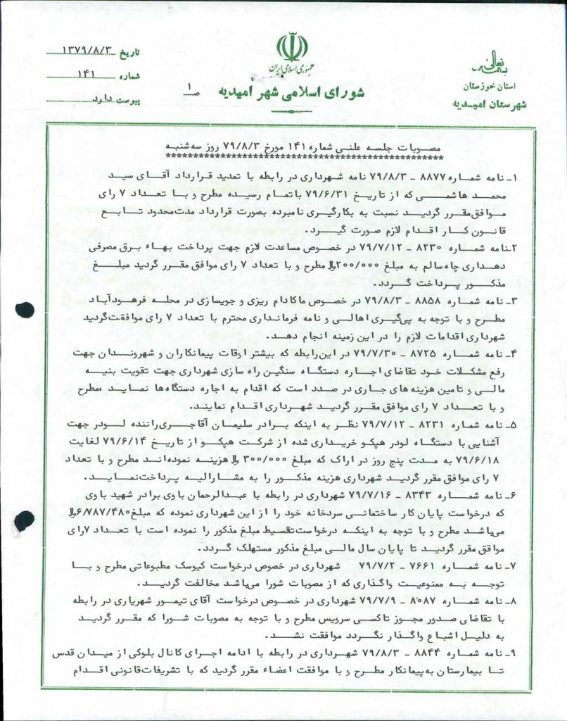 مصوبه شماره ۲ جلسه شماره ۱۴۱ شورای اسلامی شهر امیدیه