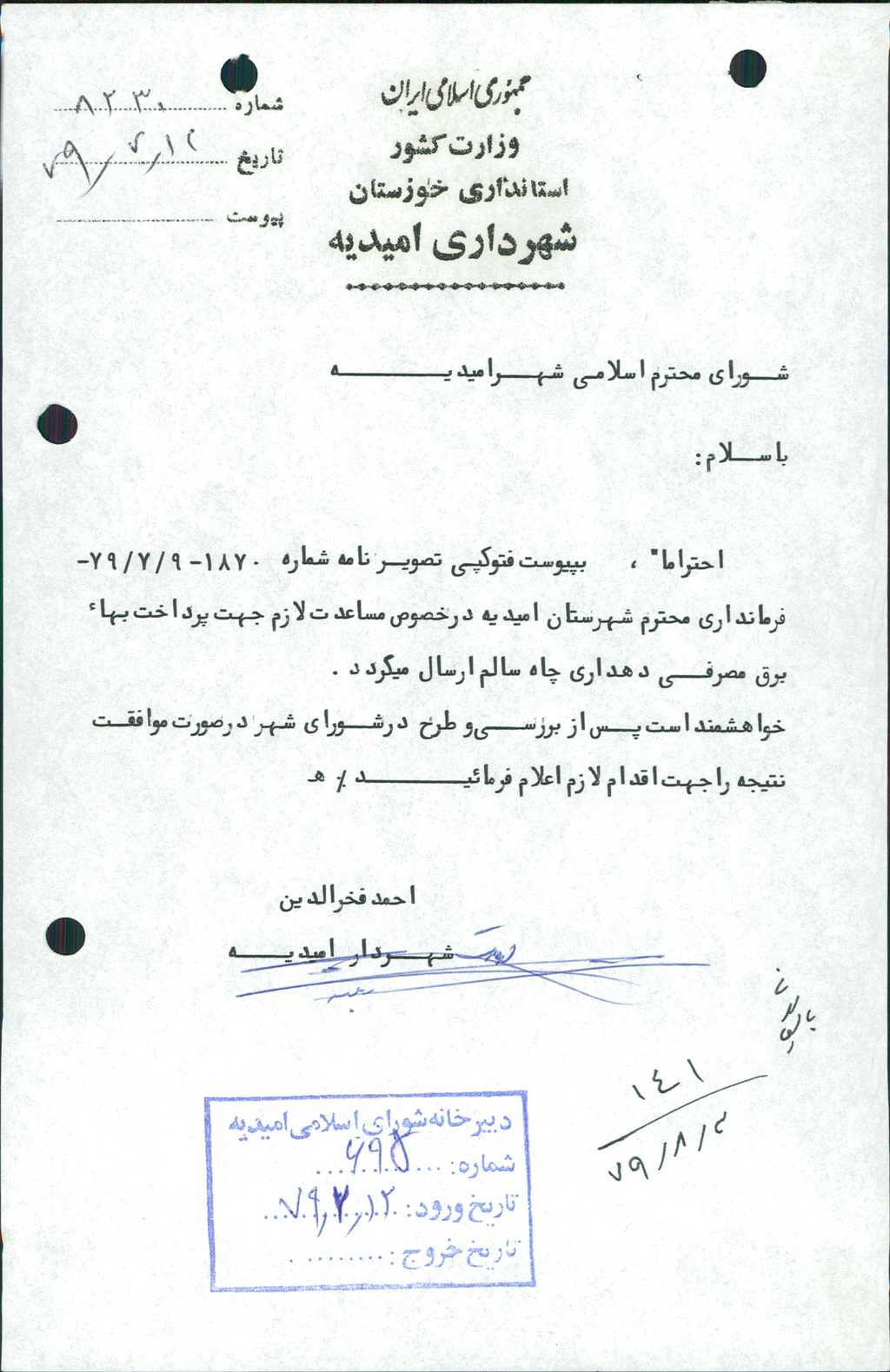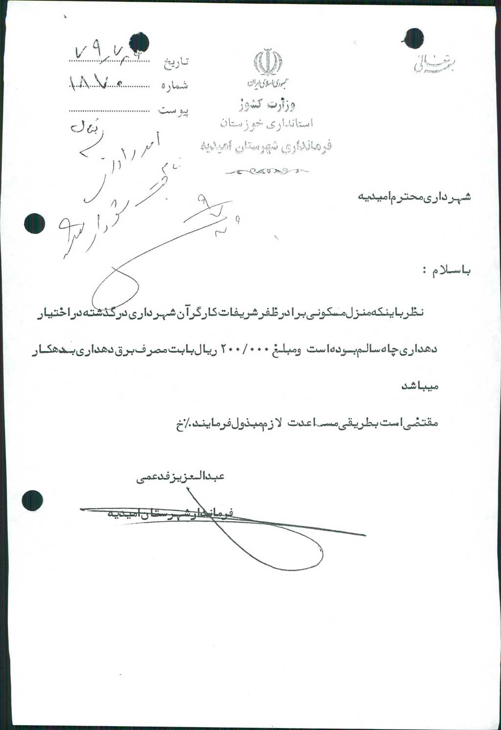 ۲-نامه شماره۸۲۳۰ مورخه ۱۲/ ۷/ ۷۹ در خصوص مساعدت لازم جهت پرداخت بهاء برق مصرفي دهداري چاه سالم به مبلغ -/۰۰۰/ ۲۰۰ ريال مطرح و با تعداد۷ رأي موافق مقرر گرديد مبلغ مذكور پرداخت گردد.