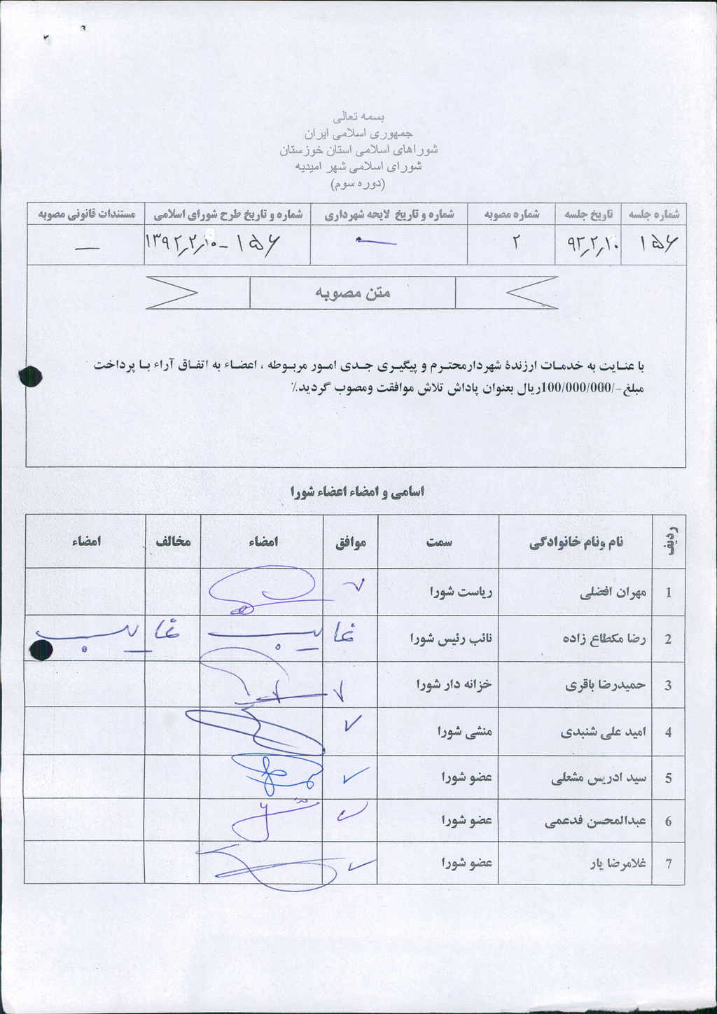 بسم الله الرحمن الرحیم مصوبه شماره ۲ جلسه شماره ۱۵۶ شورای اسلامی شهر امیدیه