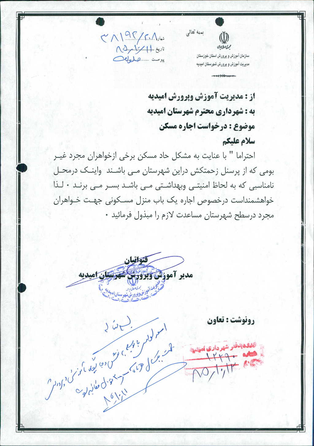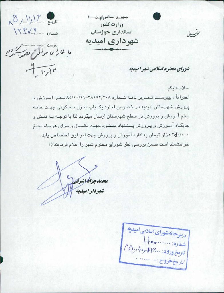 ۲-نامه شماره ۱۲۳۷۶-۱۳/ ۱۰/ ۸۵شهرداري درخصوص درخواست مدير آموزش وپرورش شهرستان مبني بر اجاره يك باب منزل جهت خانه معلم از قرار هر ماه -/۰۰۰/ ۵۰۰/ ۲ريال(دوميليون وپانصدهزارريال) كه با ۵رأي موافق مصوب گرديد.