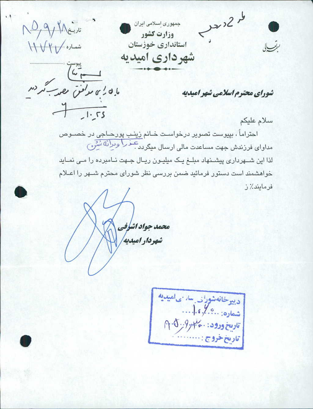 مصوبه شماره ۲ جلسه شماره ۱۵۸ مورخ ۸۵/۱۰/۲۶ شورای اسلامی شهر امیدیه