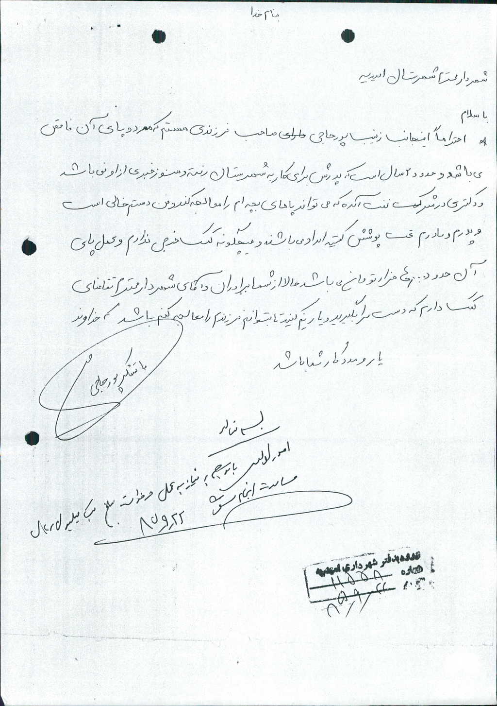 ۲-نامه شماره ۱۱۷۲۷-۲۸/ ۹/ ۸۵شهرداري درخصوص مساعدت به خانم ها زينب پورحاجي و عذرا ويرانه نشين هر كدام به مبلغ -/۰۰۰/ ۵۰۰/ ۱ريال(يك ميليون وپانصدهزارريال) و آقاي عبدالأمير نبهاني به مبلغ            -/۰۰۰/ ۵۰۰/ ۱ريال(يك ميليون وپانصد هزارريال) قرائت شد كه با ۶رأي موافق مصوب گرديد.