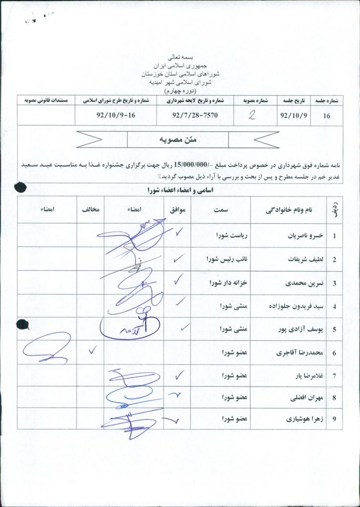 مصوبه شماره ۲ جلسه شماره ۱۶ شورای اسلامی شهر امیدیه