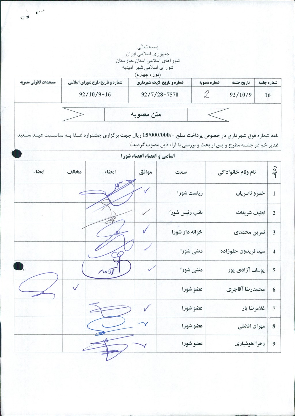 مصوبه شماره ۲ جلسه شماره ۱۶ مورخ ۹۲/۱۰/۹ شورای اسلامی شهر امیدیه