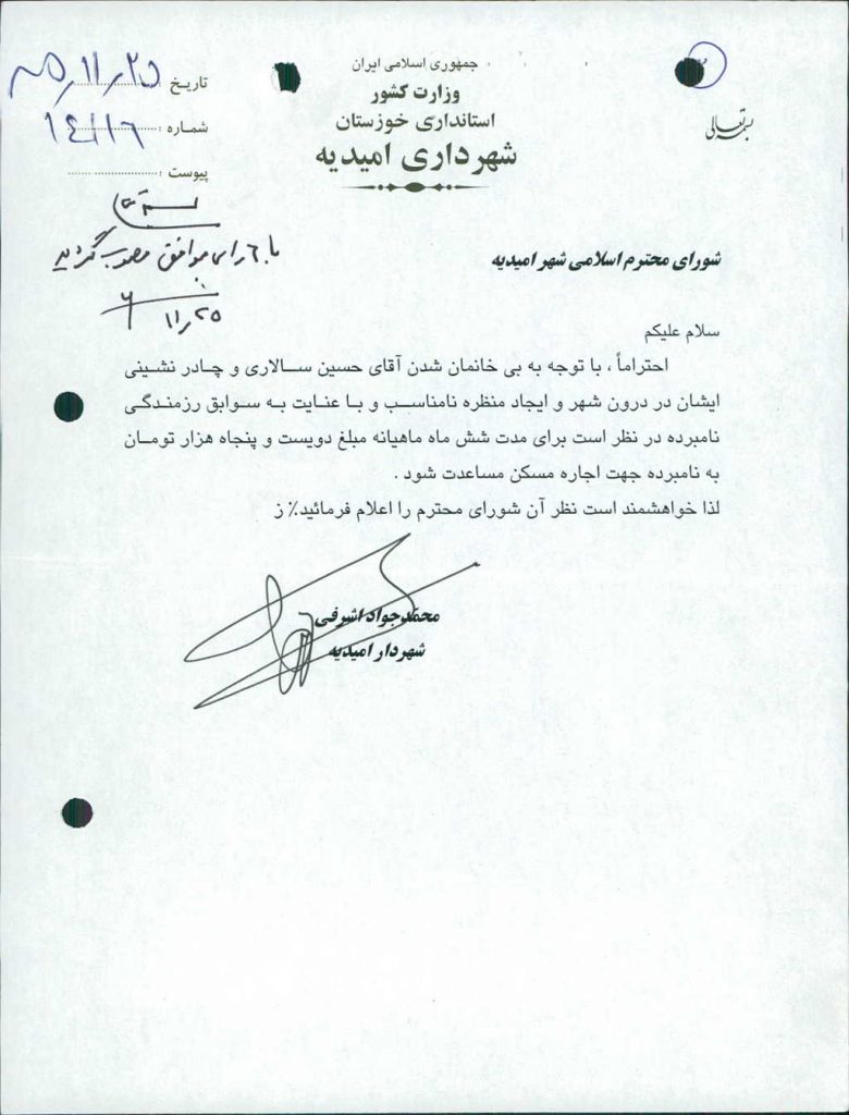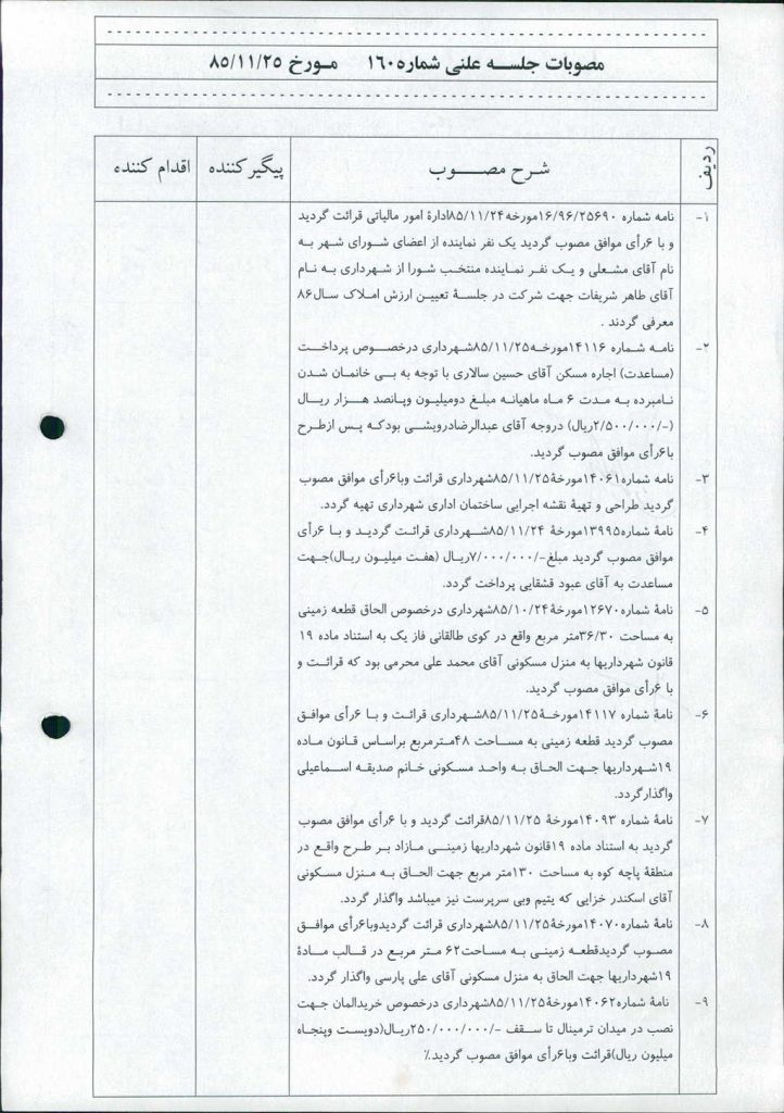 ۲-نامه شماره ۱۴۱۱۶مورخه۲۵/ ۱۱/ ۸۵شهرداري درخصوص پرداخت (مساعدت) اجاره مسكن آقاي حسين سالاري با توجه به بي خانمان شدن نامبرده به مدت ۶ ماه ماهيانه مبلغ دوميليون وپانصد هزار ريال (-/۰۰۰/ ۵۰۰/ ۲ريال) دروجه آقاي عبدالرضادرويشي بودكه پس ازطرح با۶رأي موافق مصوب گردید.
