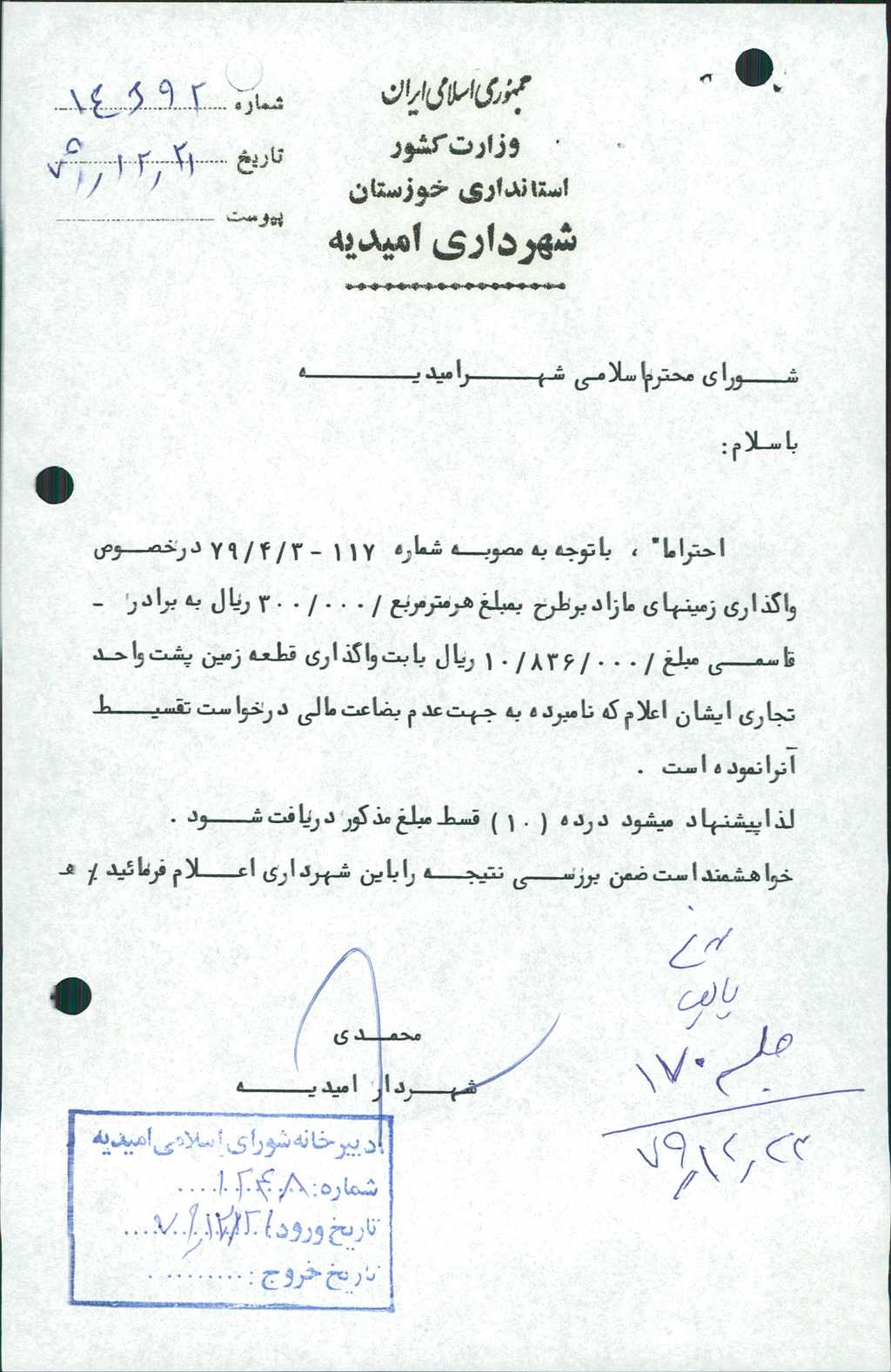 ۲-نامه شماره ۱۴۶۹۲ مورخه ۲۱/ ۱۲/ ۷۹ شهرداري در خصوص تقسيط مبلغ -/۰۰۰/ ۸۳۶ /۱۰ ريال به ده قسط بابت واگذاري قطعه زمين پشت واحد تجاري آقاي نورالله قاسمي مطرح و با توجه به عدم استطاعت مالي با ۶ رأي موافق به تصويب رسيد.