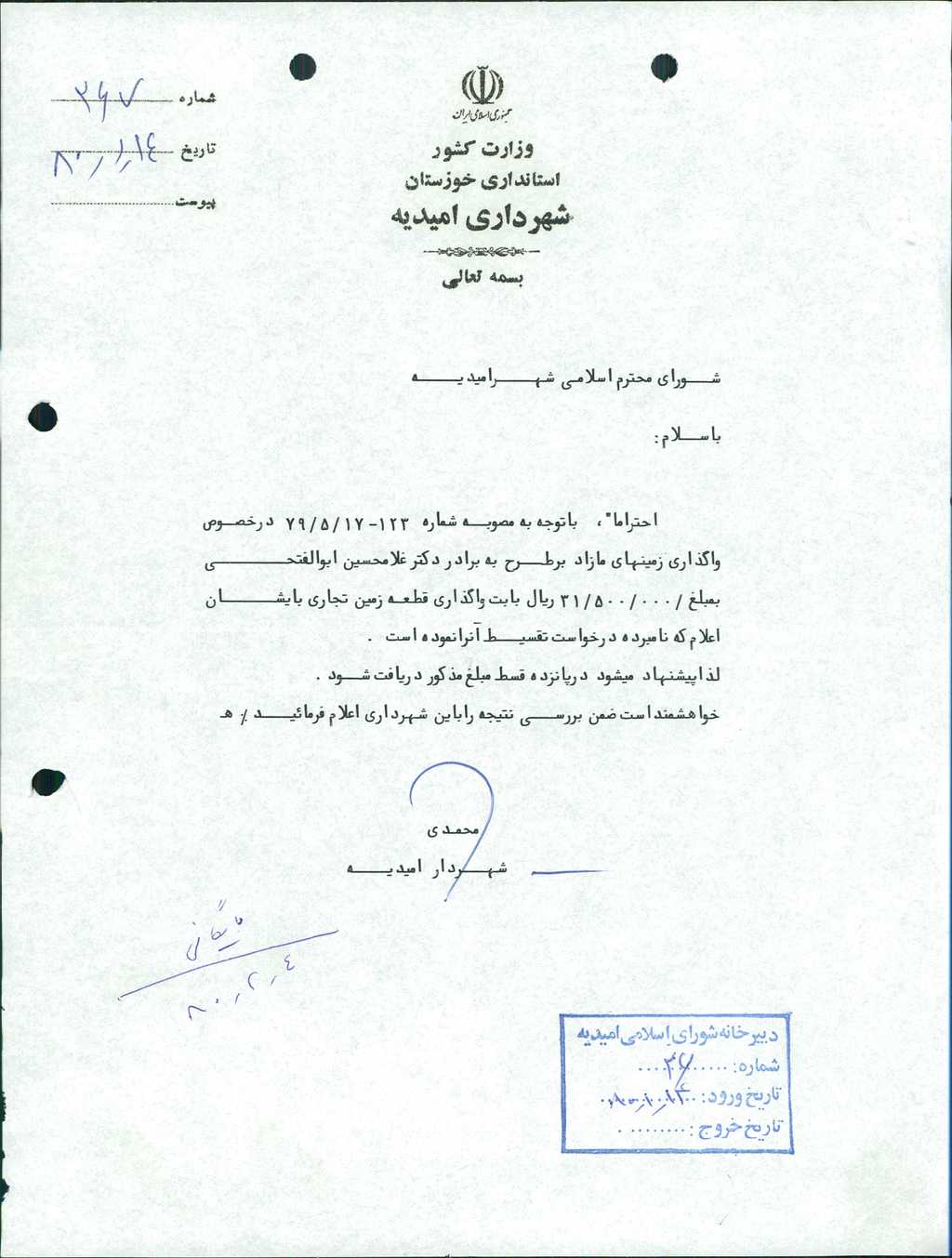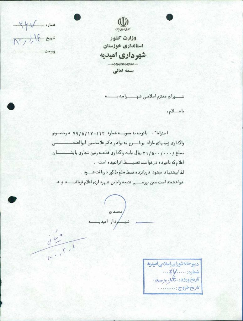 ۲-نامه شماره ۲۶۷مورخه ۱۴/ ۱/ ۸۰ شهرداري در خصوص اقساط مبلغ-/۰۰۰/ ۵۰۰/ ۳۱ ريال جهت واگذاري زمين مازاد بر طرح به آقاي دكتر غلامحسين ابوالفتحي به تعداد ۱۵ قسط مورد بررسي و با ۶ رأي موافق بتصويب رسيد.