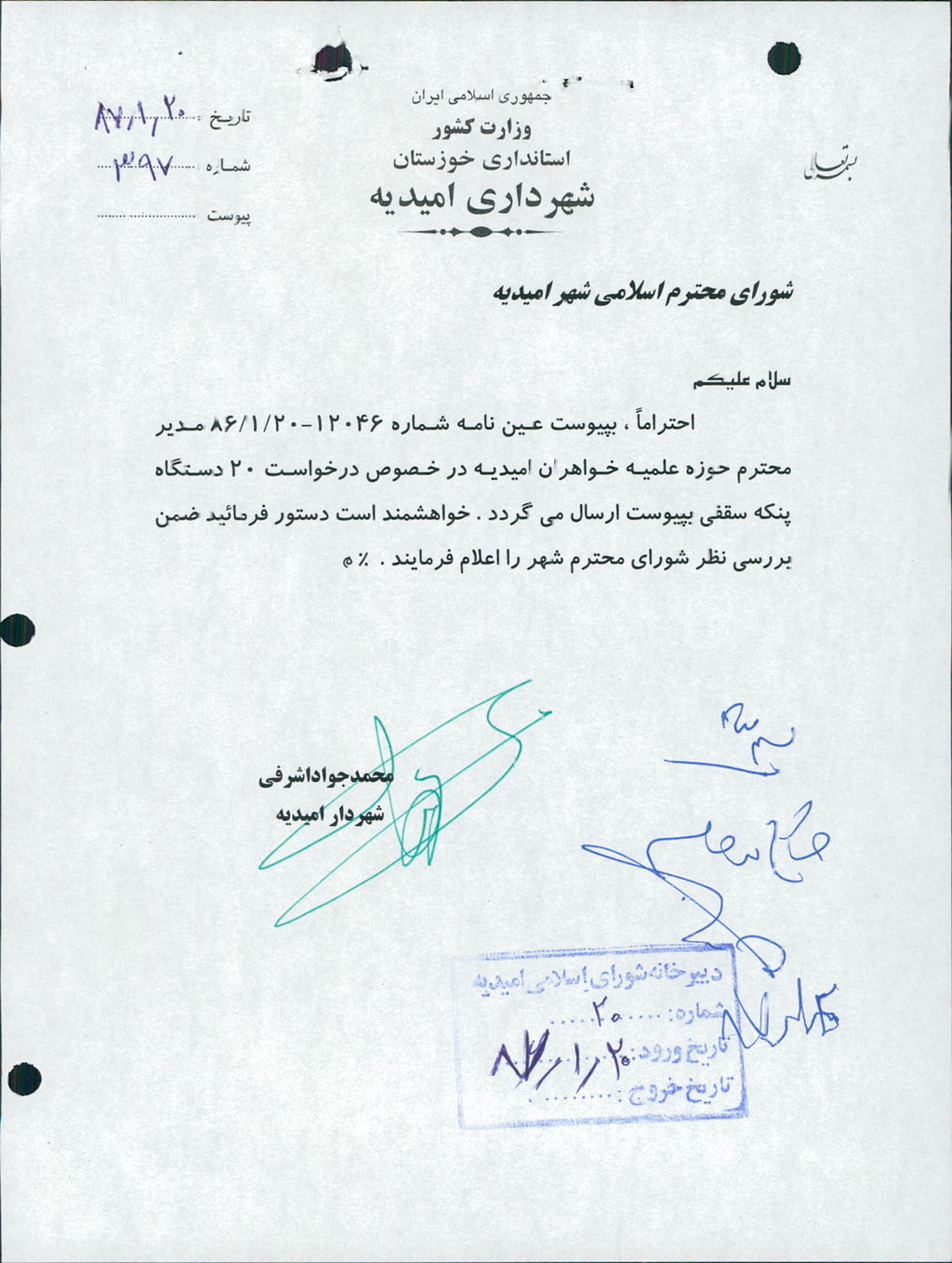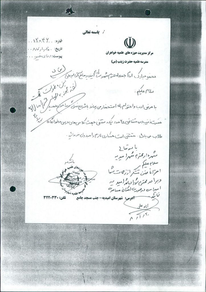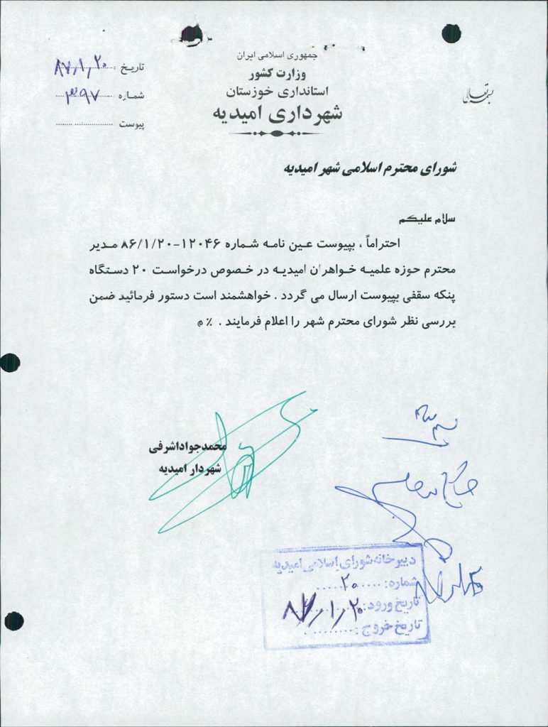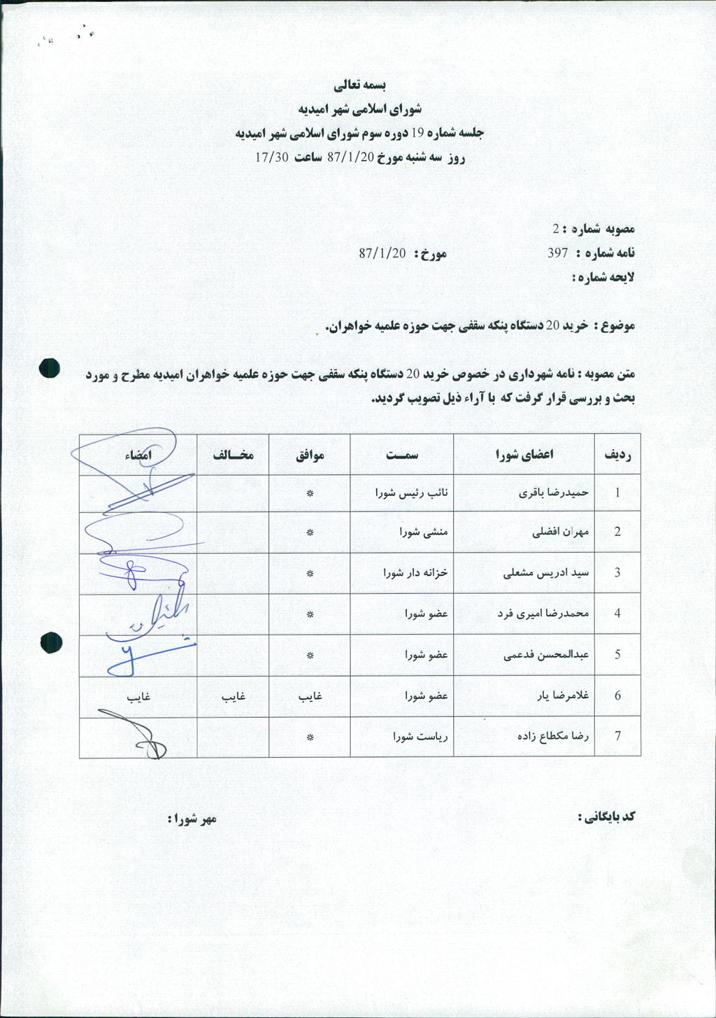 متن مصوبه : نامه شهرداري در خصوص خريد ۲۰ دستگاه پنكه سقفي جهت حوزه علميه خواهران اميديه مطرح و مورد بحث و بررسي قرار گرفت كه با آراء ذيل تصويب گرديد.