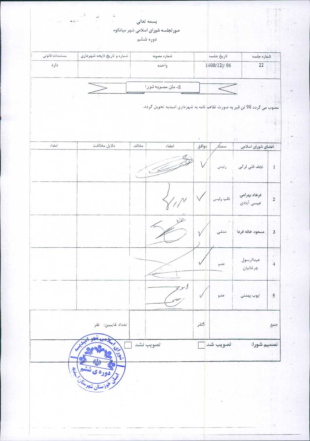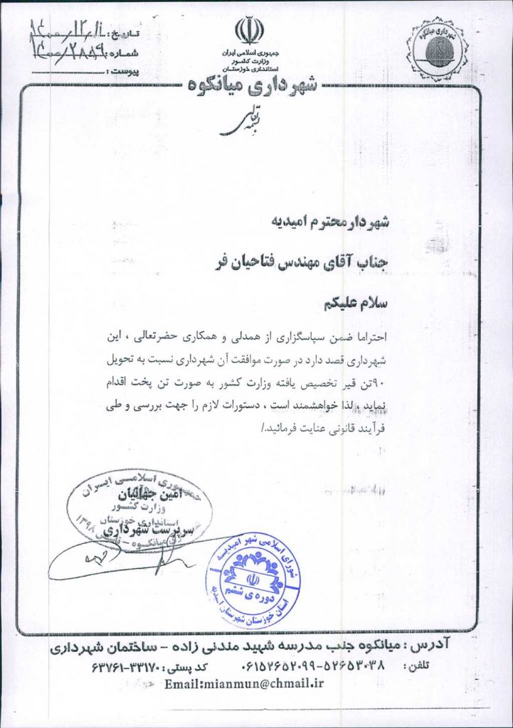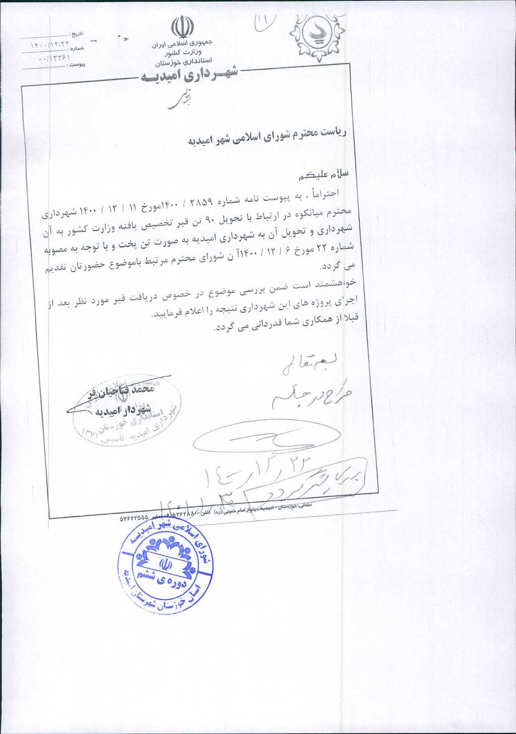نامه شماره فوق شهرداری امیدیه، در خصوص تحویل ۹۰تن قیر تخصیص یافته وزارت کشور از شهرداری میانکوه به شهرداری امیدیه به صورت تن پخت با عنایت به مصوبه شماره ۲۲-۶/ ۱۲/ ۱۴۰۰شورای اسلامی شهر میانکوه در جلسه مطرح و پس از بحث و بررسی با مجموع آراء ذیل مصوب گردید.