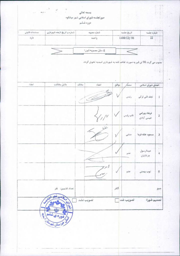 مصوبه شماره ۲ جلسه شماره ۲۱ شورای اسلامی شهر امیدیه