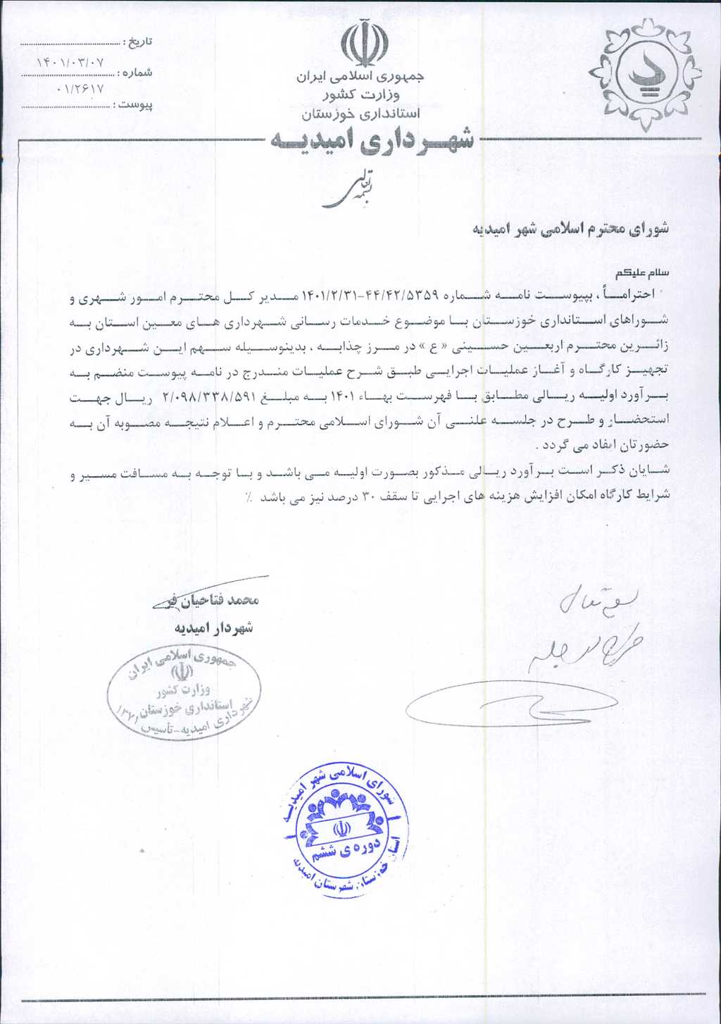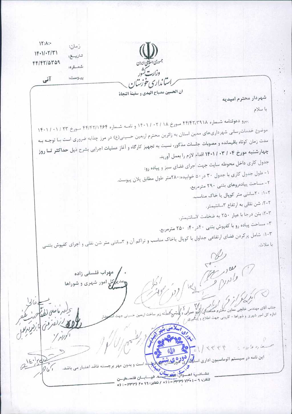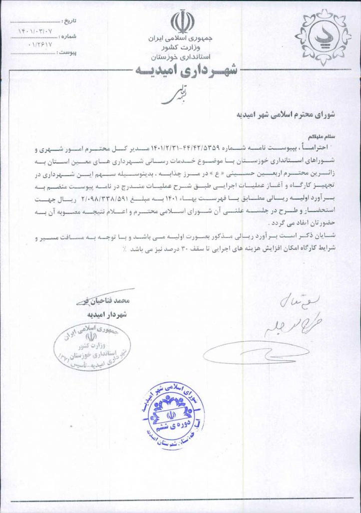 نامه شماره فوق مبنی بر اینکه شهرداری در نظر دارد، با عنایت به نامه شماره ۵۳۵۹/ ۴۲/ ۴۴-۳۱/ ۲/ ۱۴۰۱مدیرکل محترم امور شهری و شوراهای استانداری جهت خدمات رسانی شهرداریهای معین به زائرین اربعین حسینی(ع)در مرز چذابه مبلغ هشتصد میلیون ریال برای تجهیز کارگاه و آغاز عملیات اجرایی هزینه نماید، موضوع در جلسه مطرح و پس از بحث و بررسی با مجموع آراء ذیل مصوب گردید.