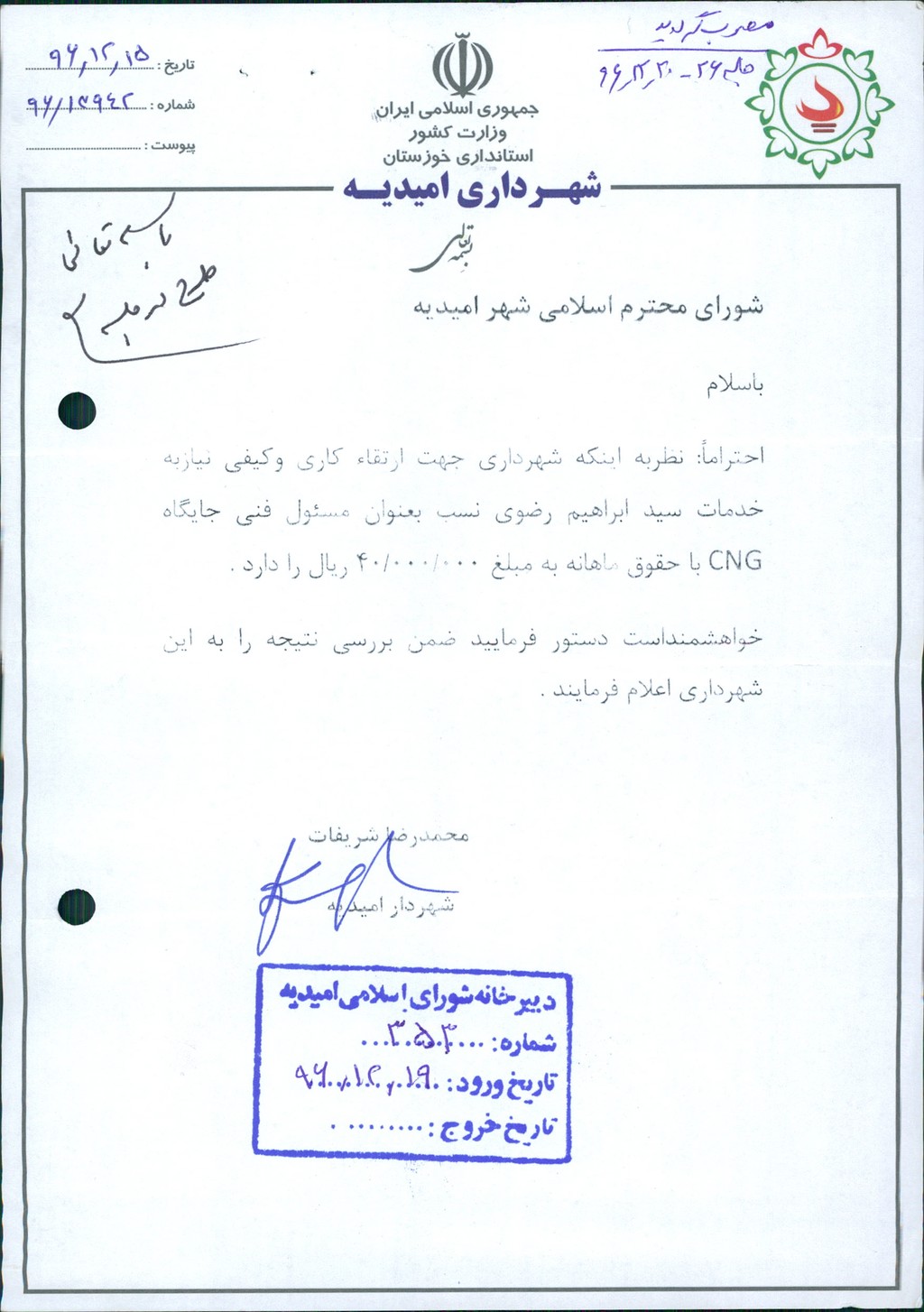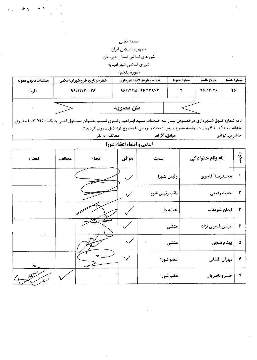 نامه شماره فوق شهرداری درخصوص نیاز به خدمات سید ابراهیم رضوی نسب بعنوان مسئول فنی جایگاه CNG با حقوق ماهانه ۴۰۰۰۰۰۰۰ ریال در جلسه مطرح و پس از بحث و بررسی با مجموع آراء ذیل مصوب گردید%