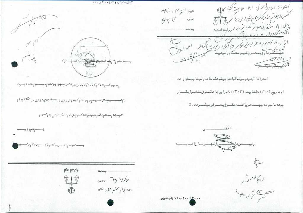۲-نـامه شماره۴۸۲۷مـورخ۳/ ۴/ ۸۱ شهرداري مبنــي برپرداخت حــق الزحمه خانم زليخـا يوسفـي از تاريخ ۱/ ۳/ ۸۱ لغايت۳۱/ ۳/ ۸۱قرائت گرديد كه با۶رأي موافق به تصويب رسيـد.