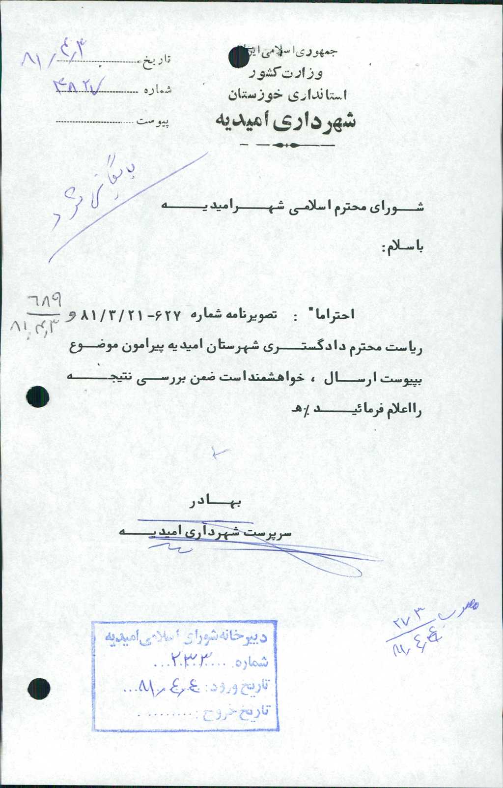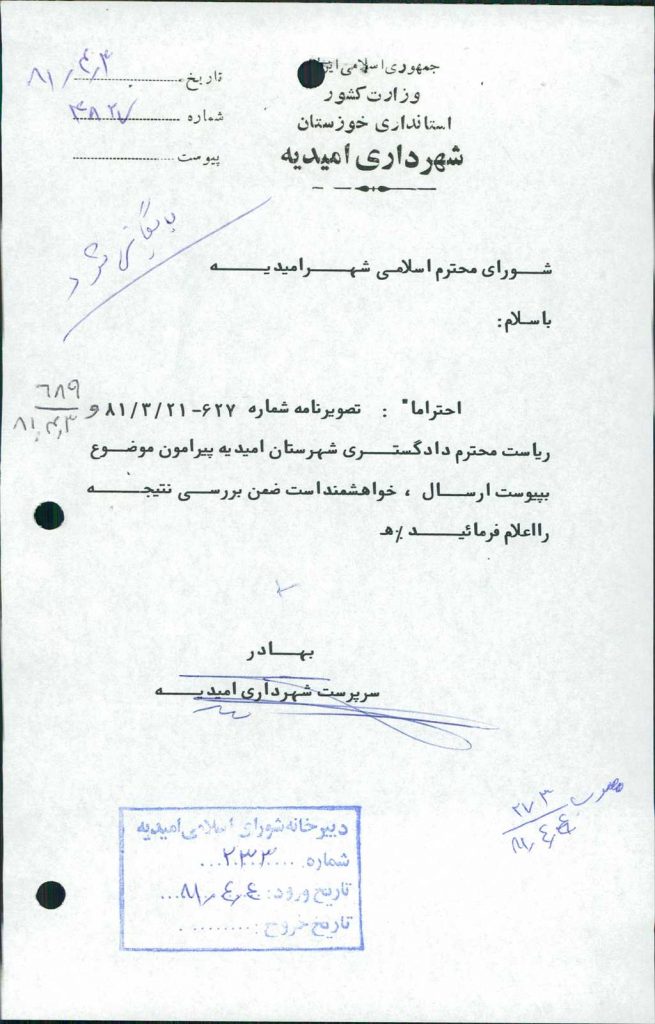 بسم الله الرحمن الرحیم مصوبه شماره ۲ جلسه شماره ۲۷۳ شورای اسلامی شهر امیدیه