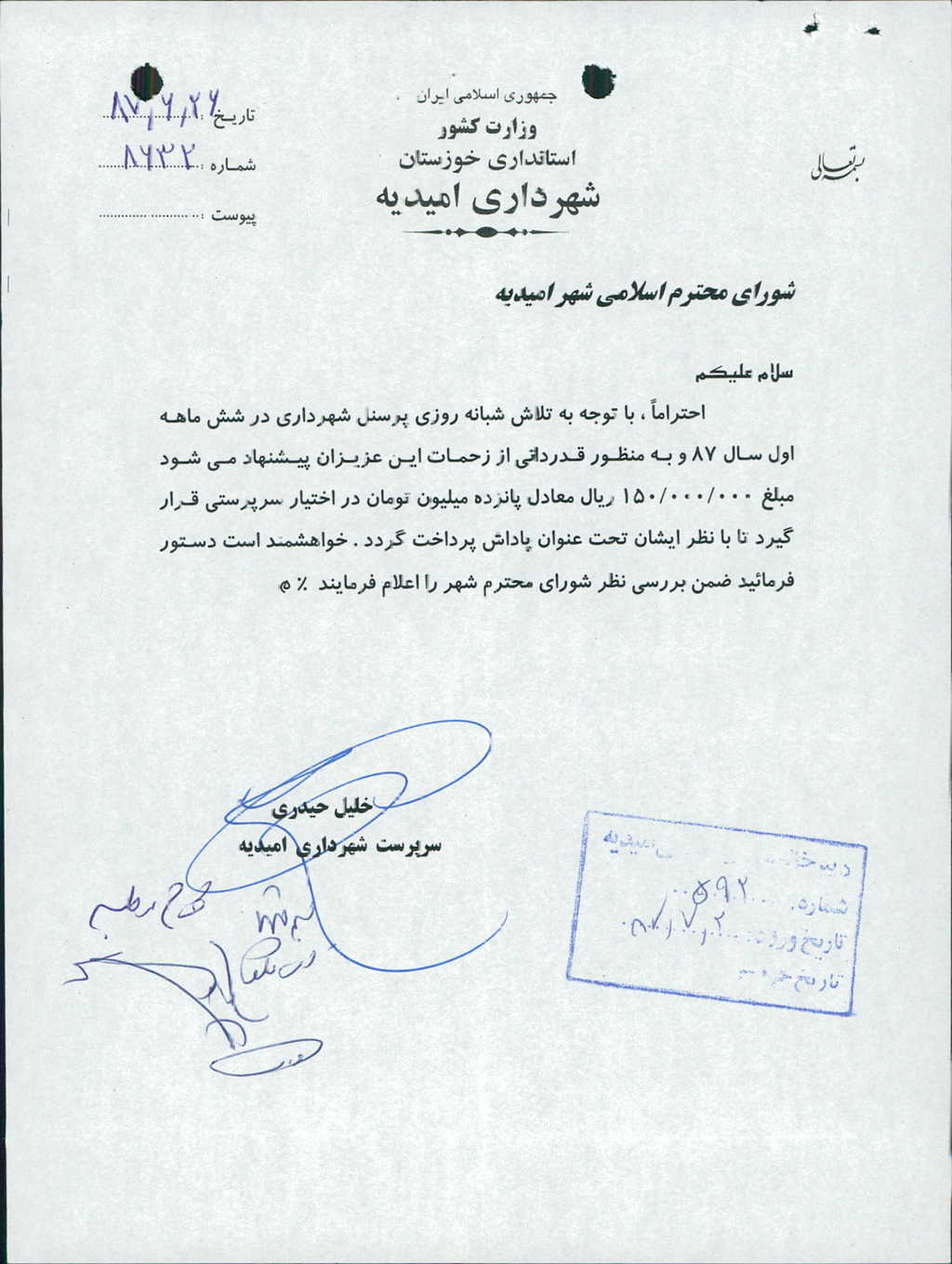 موضوع : درخواست پاداش جهت پرسنل شهرداری .