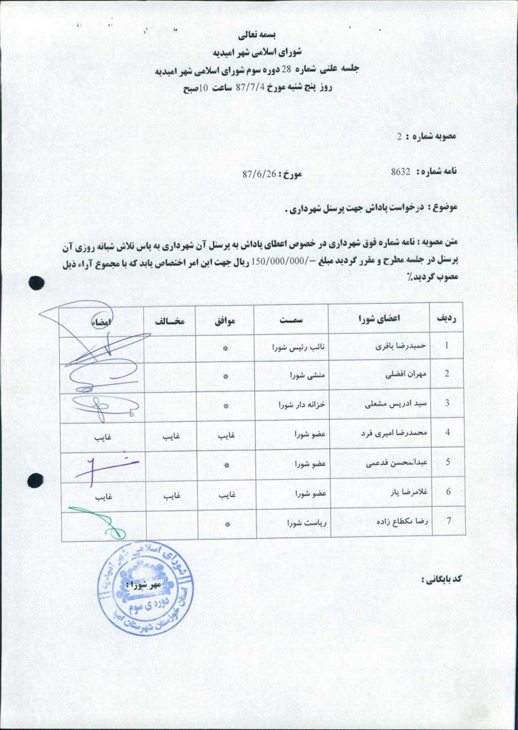 متن مصوبه : نامه شماره فوق شهرداری در خصوص اعطای پاداش به پرسنل آن شهرداری به پاس تلاش شبانه روزی آن پرسنل در جلسه مطرح و مقرر گردید مبلغ ۱۵۰۰۰۰۰۰۰ ریال جهت این امر اختصاص یابد که با مجموع آراء ذیل مصوب گردید%