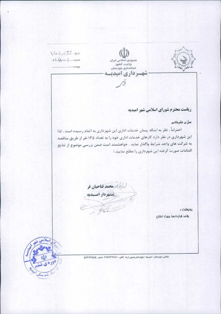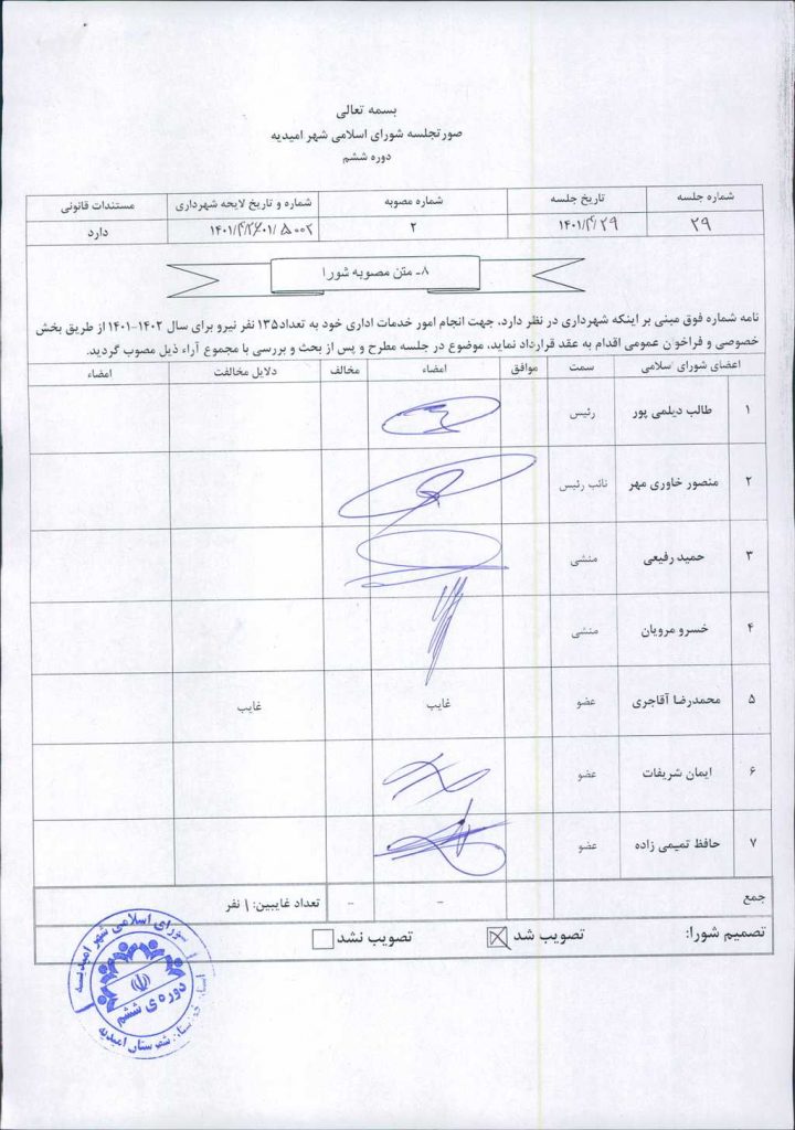 مصوبه شماره ۲ جلسه شماره ۲۹ شورای اسلامی شهر امیدیه