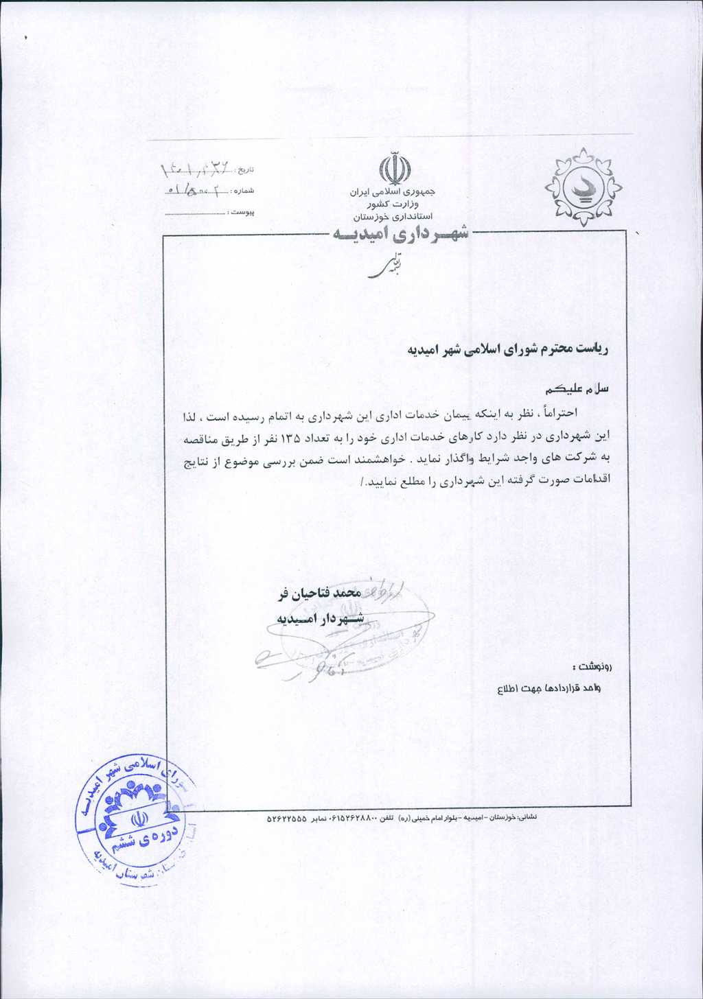 نامه شماره فوق مبنی بر اینکه شهرداری در نظر دارد، جهت انجام امور خدمات اداری خود به تعداد۱۳۵ نفر نیرو برای سال ۱۴۰۲-۱۴۰۱ از طریق بخش خصوصی و فراخوان عمومی اقدام به عقد قرارداد نماید، موضوع در جلسه مطرح و پس از بحث و بررسی با مجموع آراء ذیل مصوب گردید.