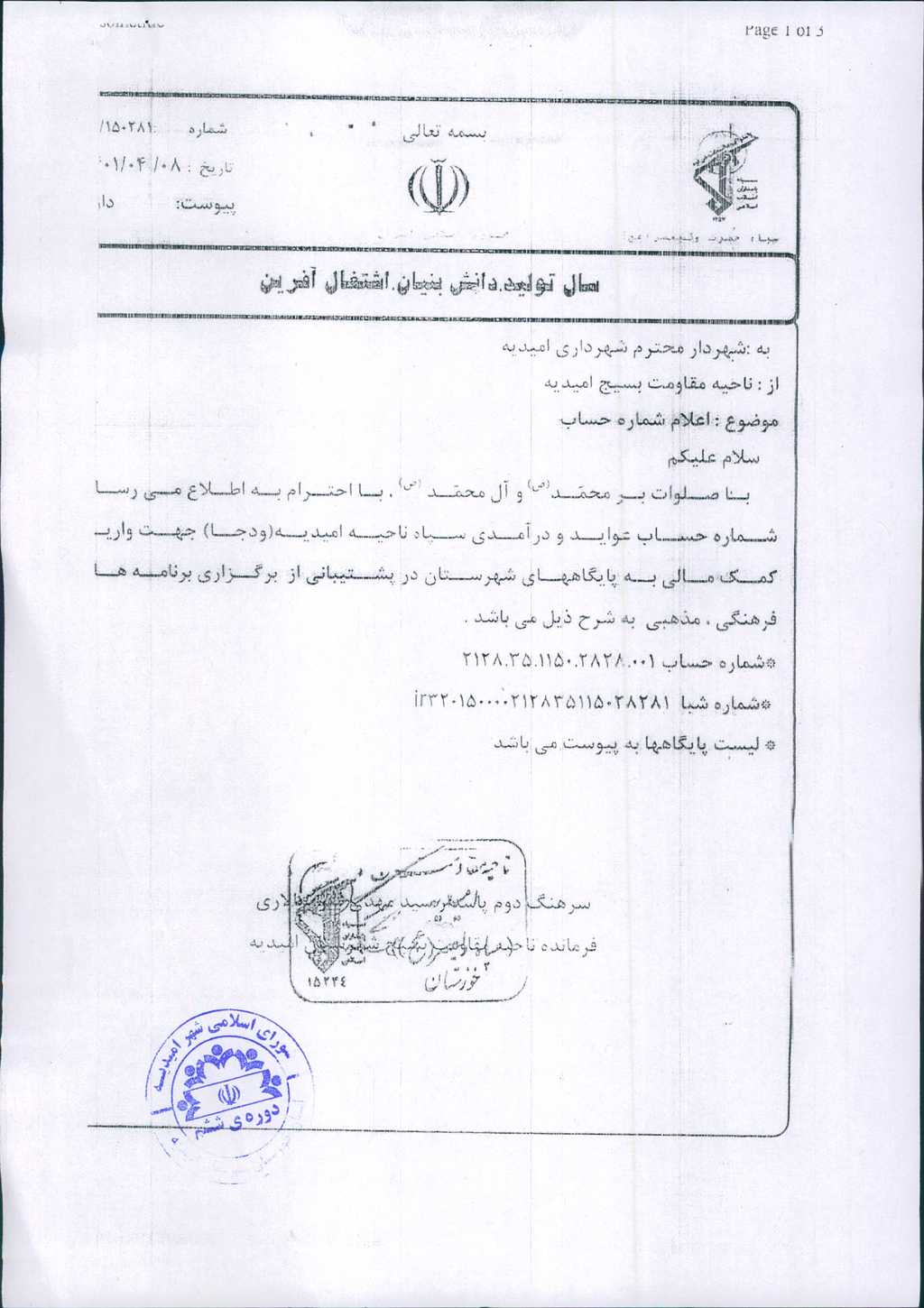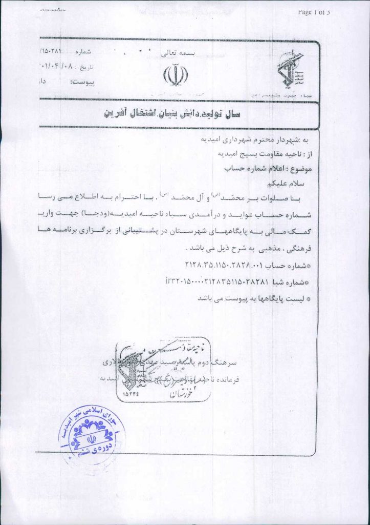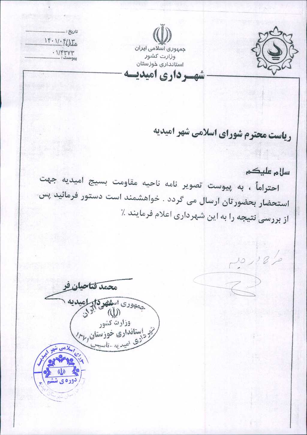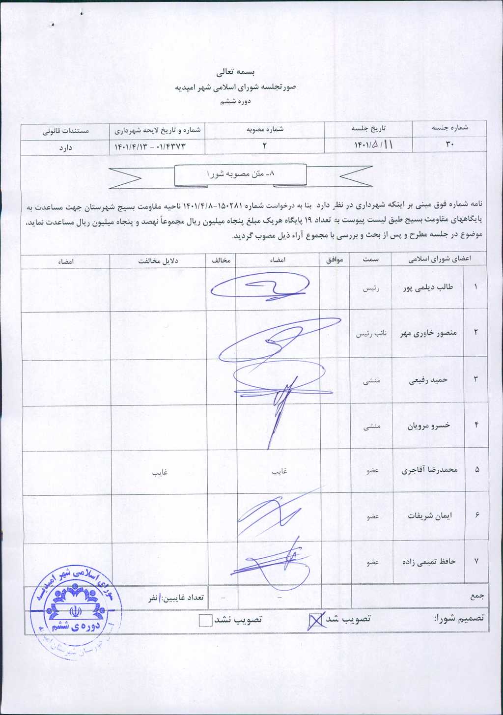 نامه شماره فوق مبنی بر اینکه شهرداری در نظر دارد بنا به درخواست شماره ۱۵۰۲۸۱-۸/ ۴/ ۱۴۰۱ ناحیه مقاومت بسیج شهرستان جهت مساعدت به پایگاههای مقاومت بسیج طبق لیست پیوست به تعداد ۱۹ پایگاه هریک مبلغ پنجاه میلیون ریال مجموعاً نهصد و پنجاه میلیون ریال مساعدت نماید، موضوع در جلسه مطرح و پس از بحث و بررسی با مجموع آراء ذیل مصوب گردید.