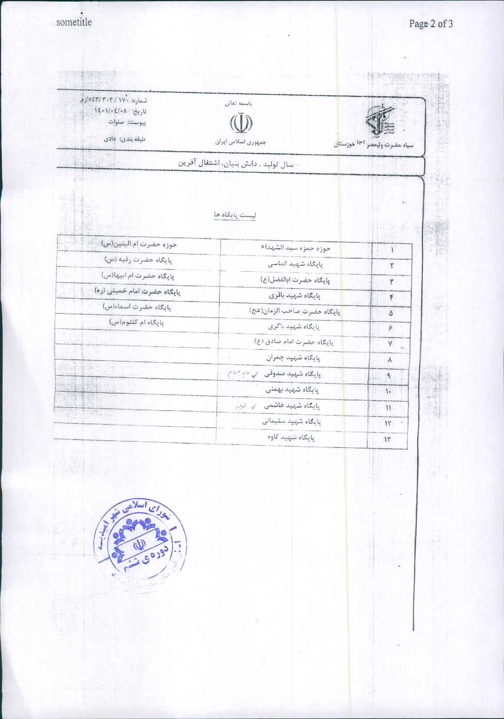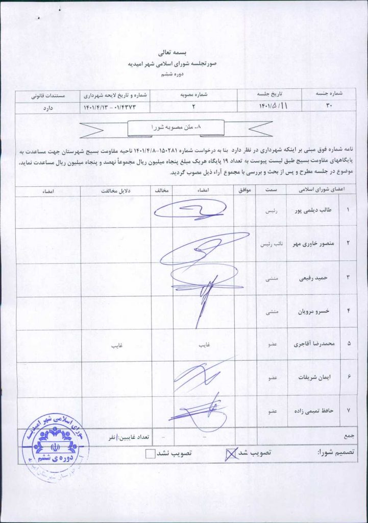 مصوبه شماره ۲ جلسه شماره۳۰شورای اسلامی شهر امیدیه