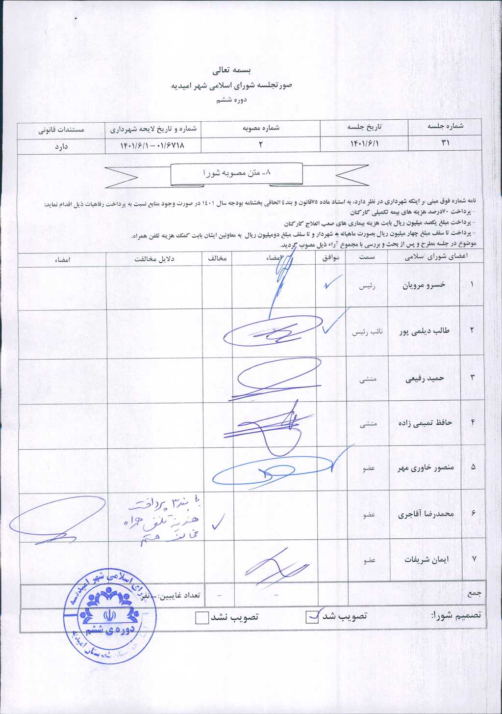 مصوبه شماره ۲ جلسه شماره۳۱ شورای اسلامی شهر امیدیه