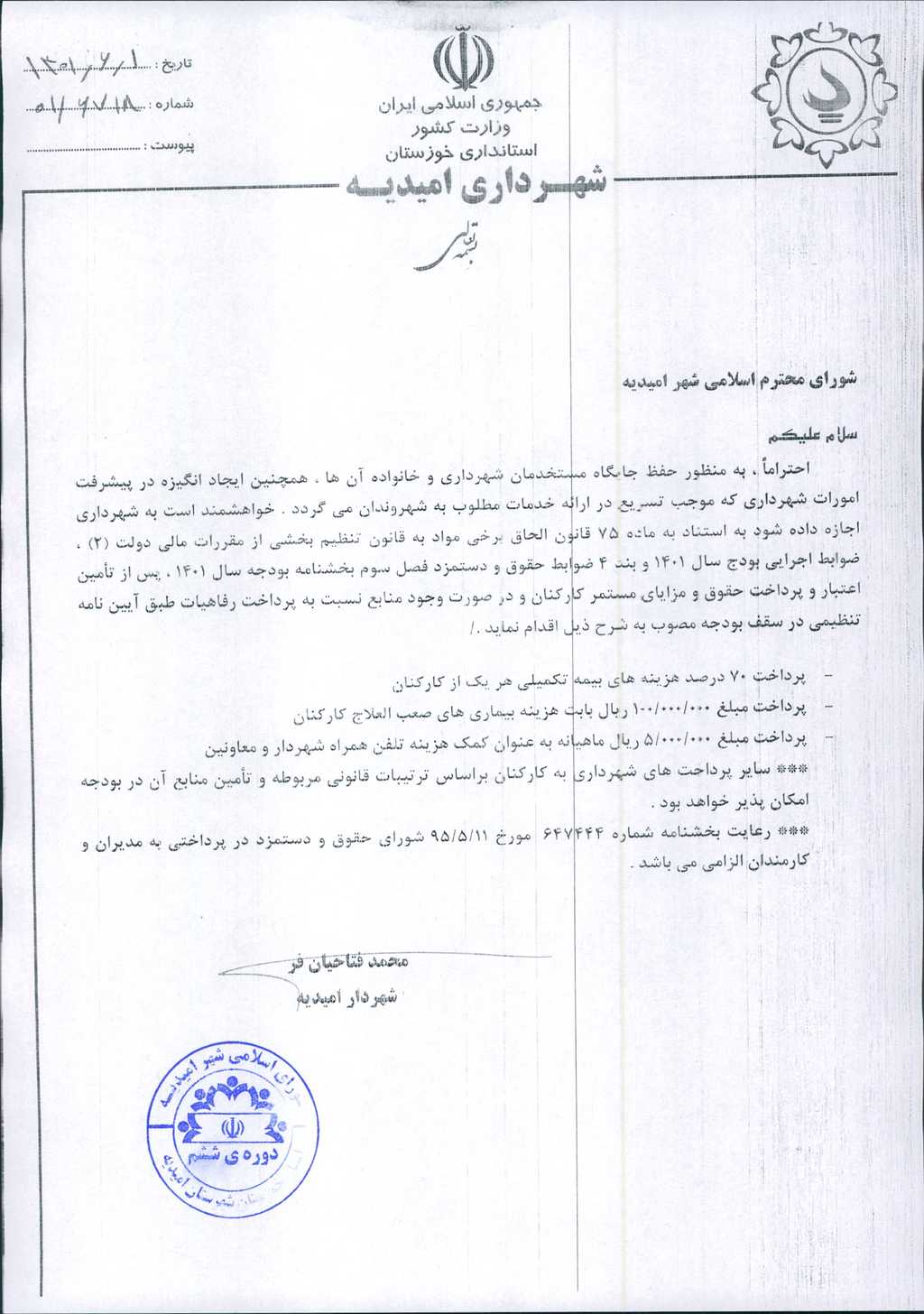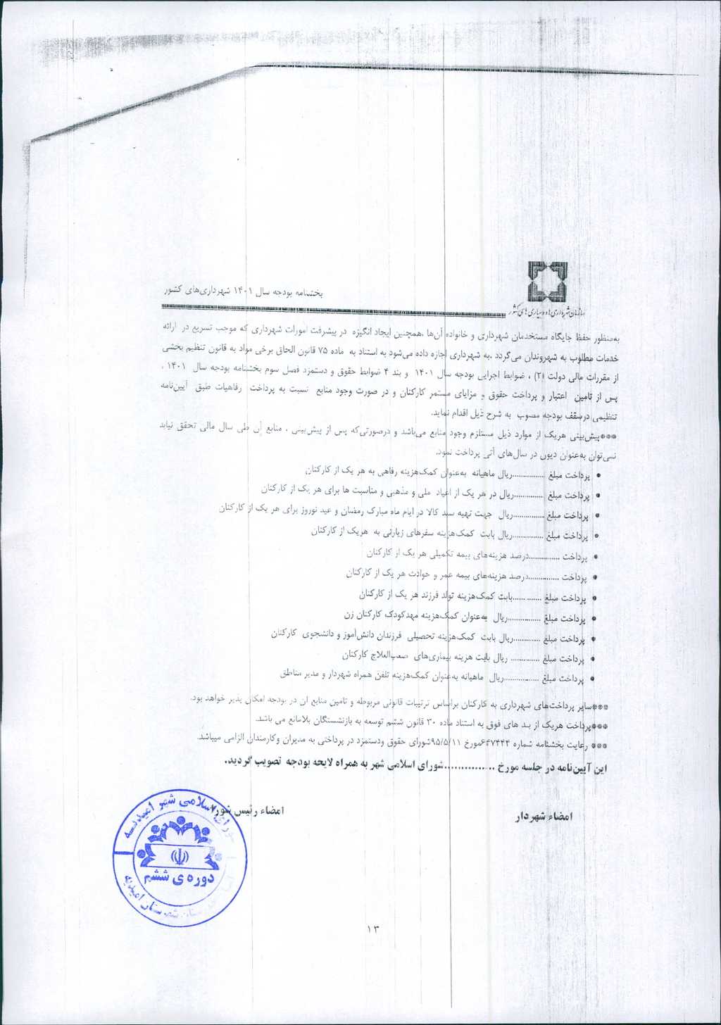 نامه شماره فوق مبنی بر اینکه شهرداری در نظر دارد، به استناد ماده ۷۵قانون و بند۴ الحاقی بخشنامه بودجه سال ۱۴۰۱ در صورت وجود منابع نسبت به پرداخت رفاهیات ذیل اقدام نماید: