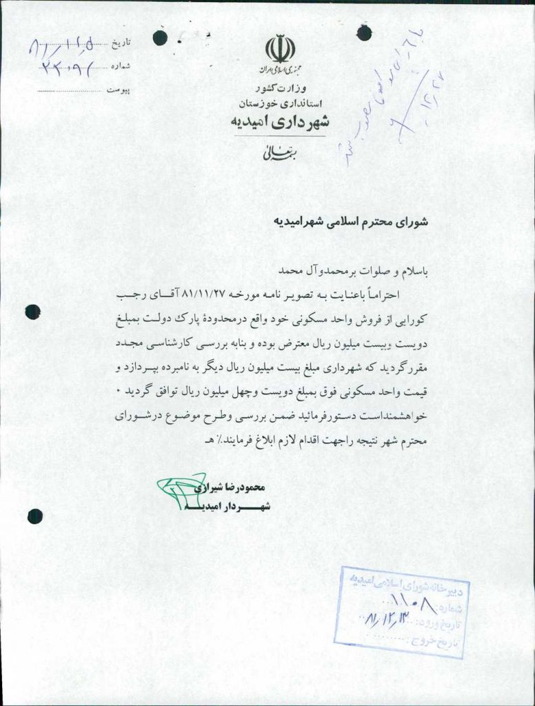 ۲-نامه شماره ۲۲۰۹۲-۵/ ۱۲/ ۸۱شهرداري مبني براعتراض آقاي رجب كورايي فروشنده واحد مسكوني در محدوده پارك دولت به مبلغ دويست ميليون ريال وبررسي كارشناسي مجدد مقرر گرديد كه شهرداري مبلغ بيست ميليون ريال ديگر به نامبـرده بپردازد و قيمت واحد مسكوني فوق به مبلغ دويست وچهل ميليون ريال قرائت گرديد و با ۶رأي موافق به تصويب رسيد.