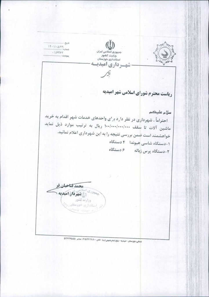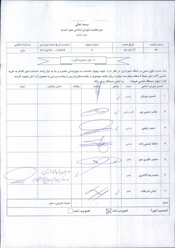 مصوبه شماره ۲ جلسه شماره۳۲ شورای اسلامی شهر امیدیه