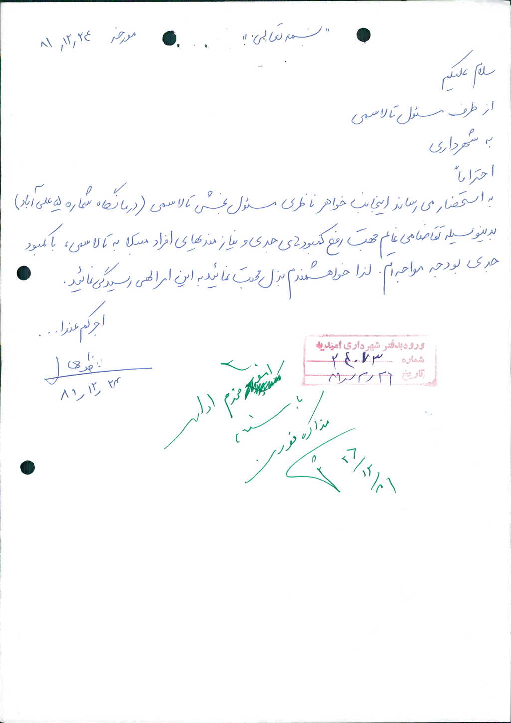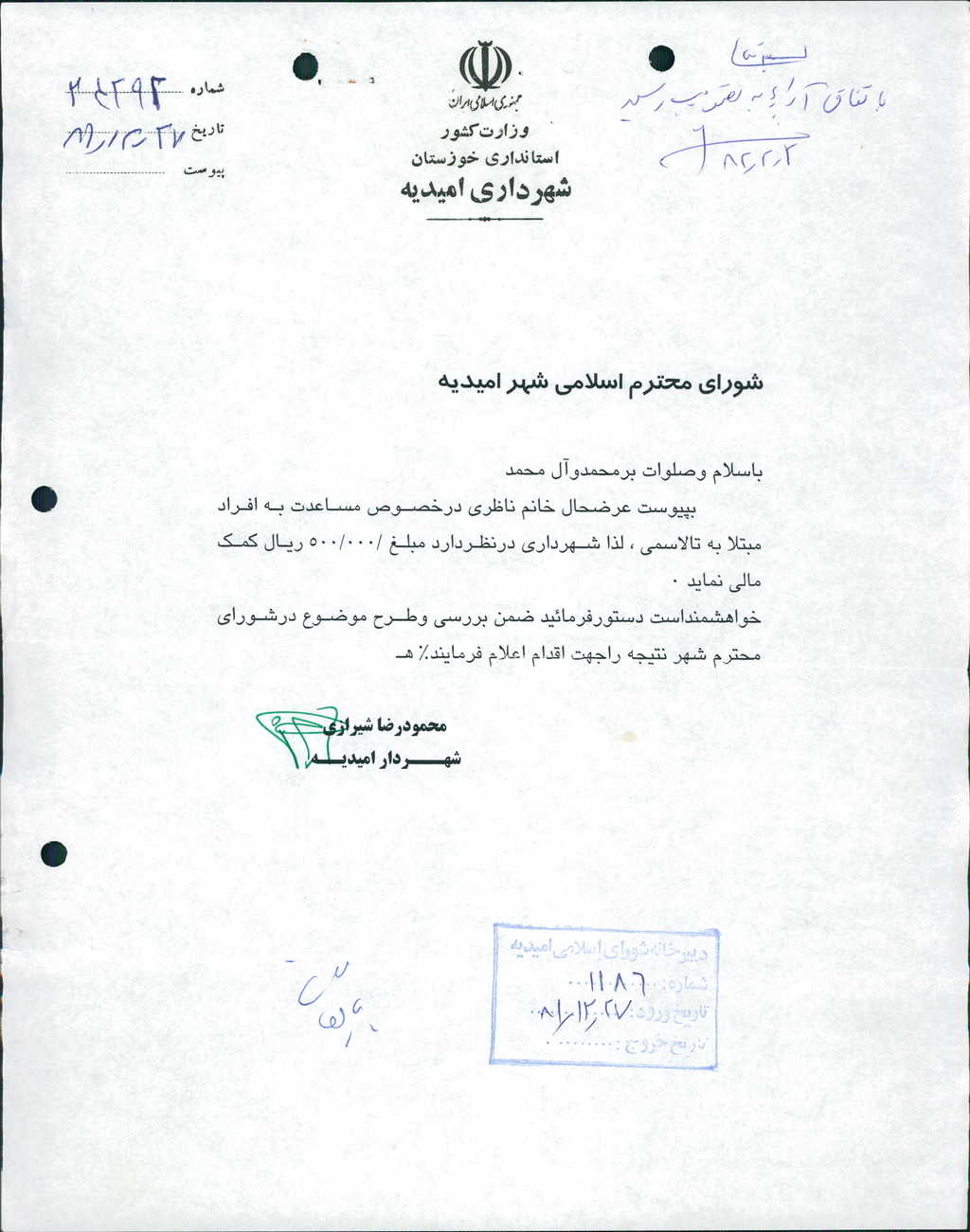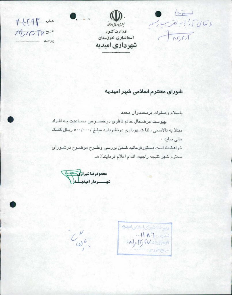 ۲-نامه شماره ۲۴۲۹۲-۲۷/ ۱۲/ ۸۱شهرداري درخصوص مساعدت به بيماران تالاسمي مطرح وبا۶رأي موافق تصويب شدكه مبلغ۰۰۰/ ۵۰۰ريال(پانصد هزار ريال)به خانم ناظري مسئول بخش تالاسمي درمانگاه شماره ۵(پنج) پرداخت گـردد.
