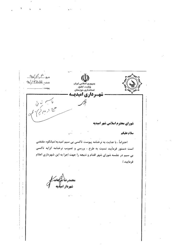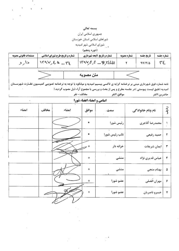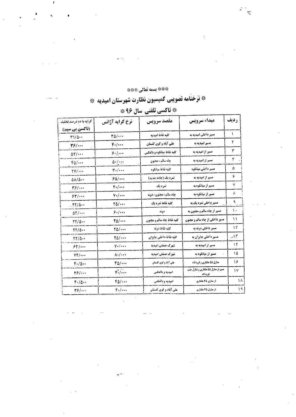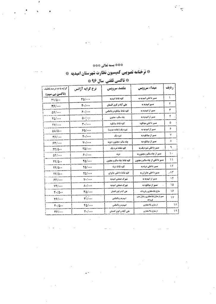 نامه شماره فوق شهرداری مبنی بر نرخنامه کرایه ی تاکسی بیسیم امیدیه و میانکوه با توجه به نرخنامه تصویبی کمیسیون نظارت شهرستان امیدیه (طبق لیست پیوستی )در جلسه مطرح و پس از بحث و بررسی با مجموع آراء ذیل مصوب گردید%
