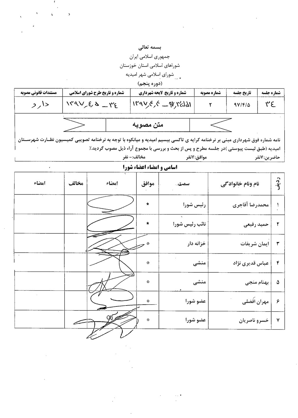 مصوبه شماره ۲ جلسه شماره ۳۴ شورای اسلامی شهر امیدیه