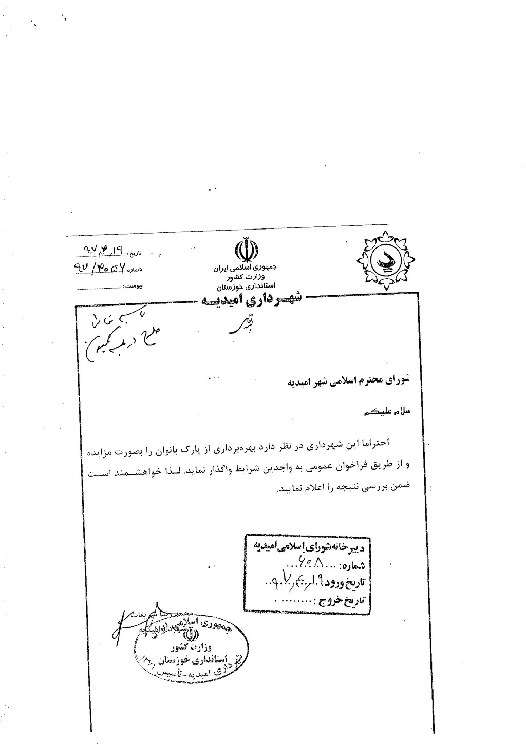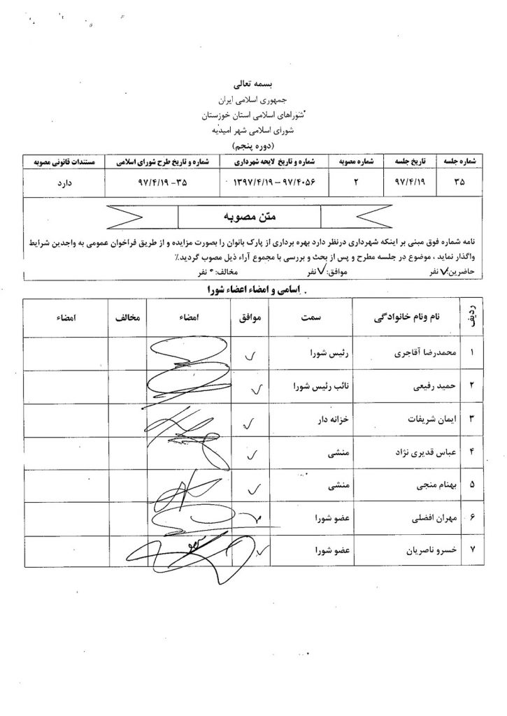 مصوبه شماره ۲ جلسه شماره ۳۵ شورای اسلامی شهر امیدیه