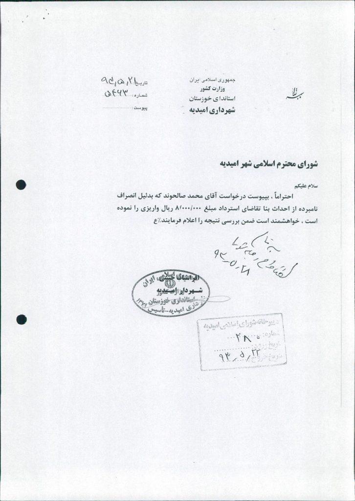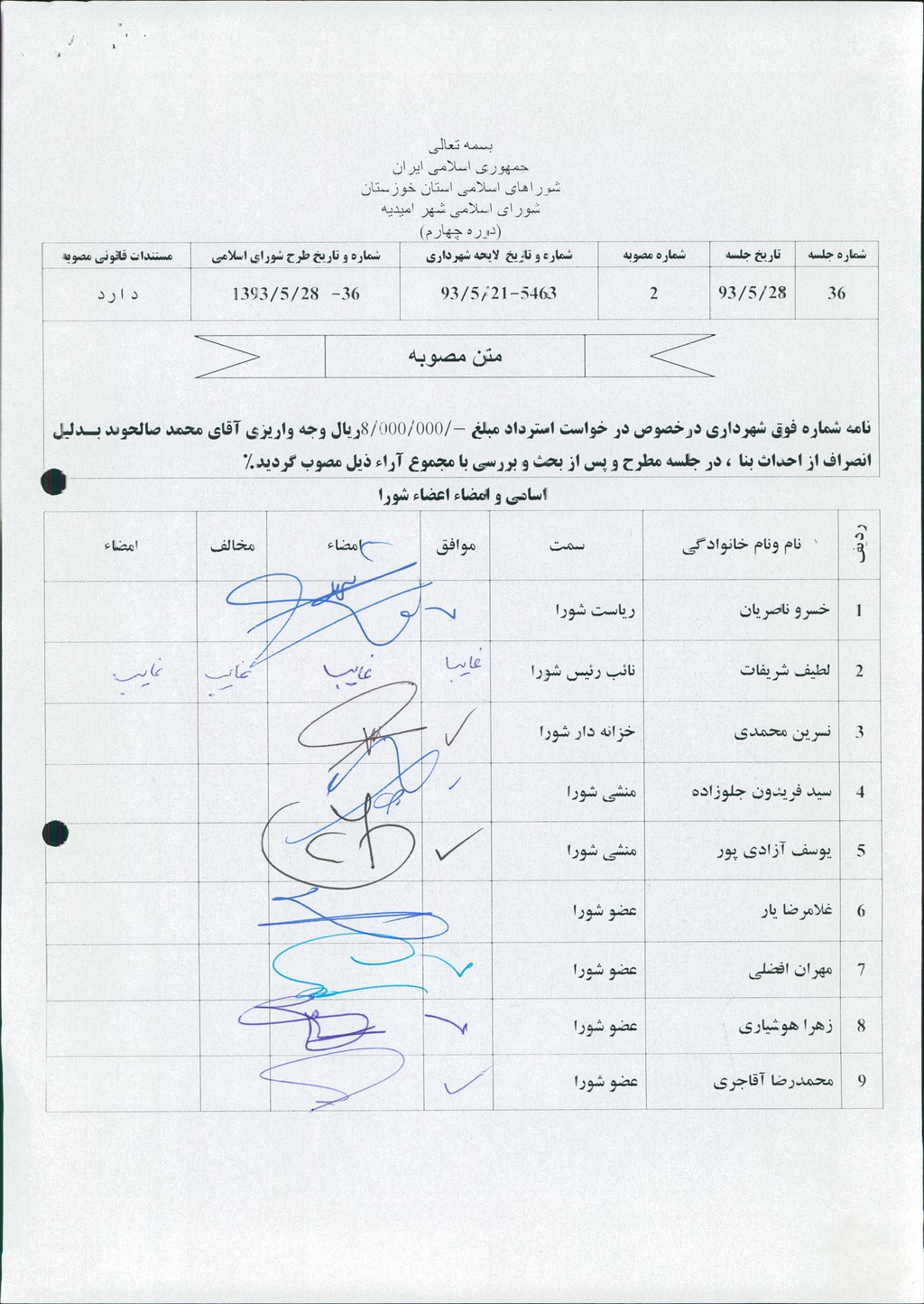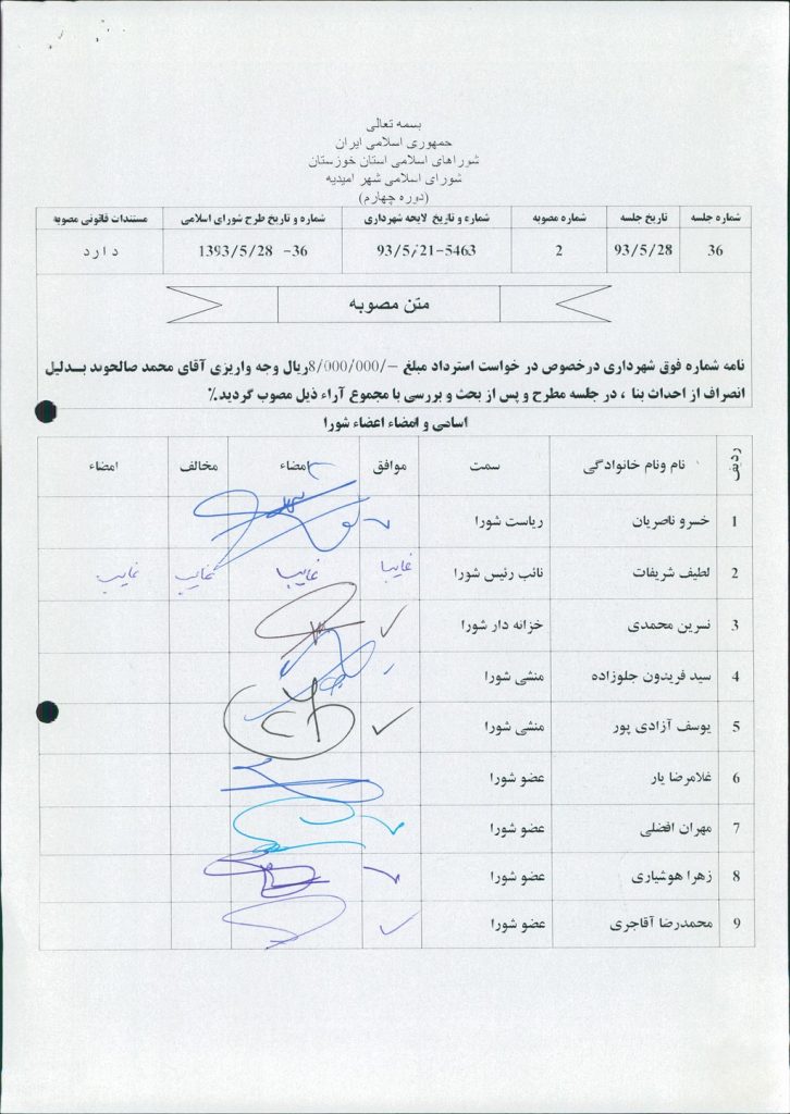 مصوبه شماره ۲ جلسه شماره ۳۶ شورای اسلامی شهر امیدیه