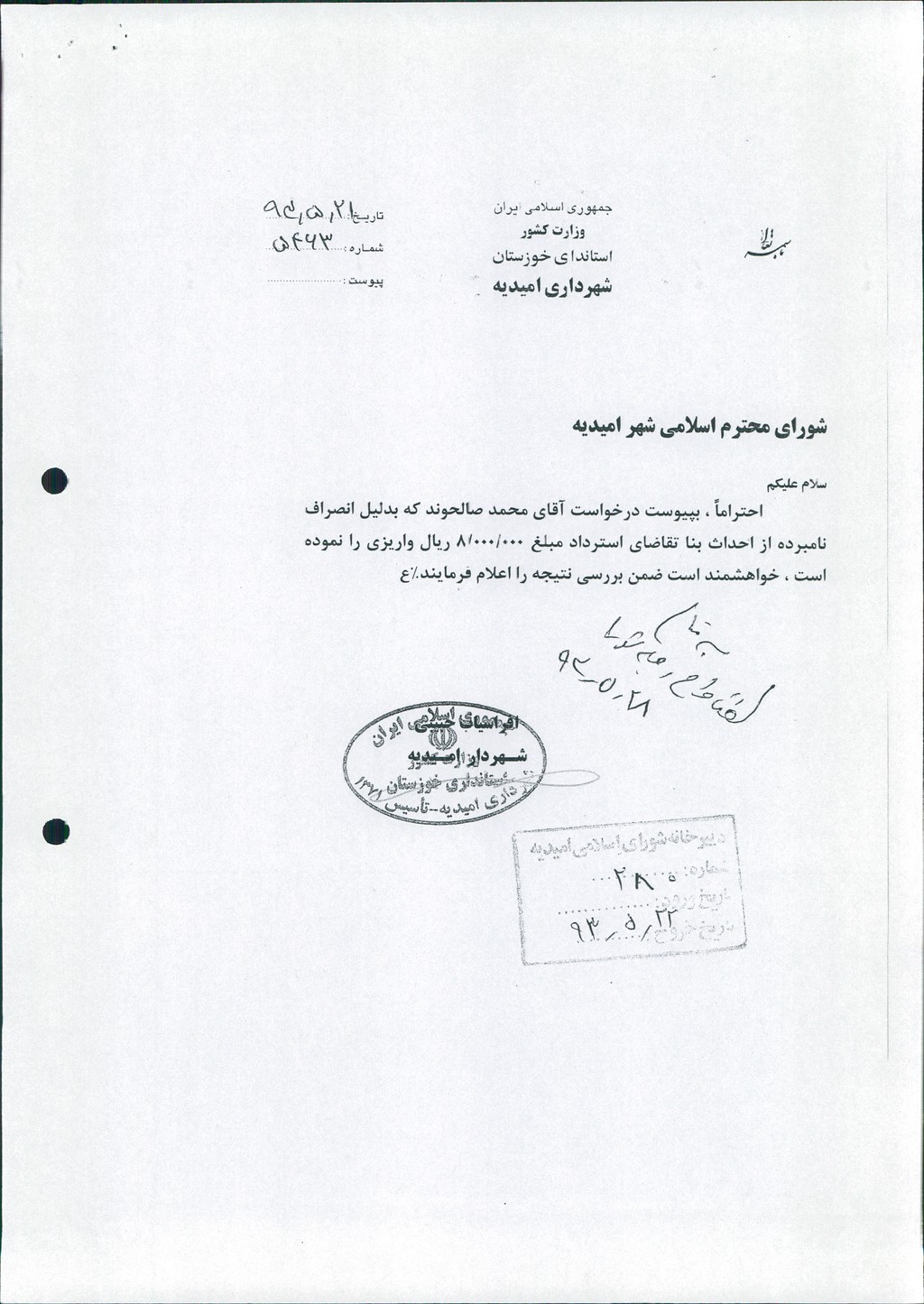 نامه شماره فوق شهرداری درخصوص در خواست استرداد مبلغ ۸۰۰۰۰۰۰ ريال وجه واریزی آقای محمد صالحوند بدلیل انصراف از احداث بنا ، در جلسه مطرح و پس از بحث و بررسی با مجموع آراء ذیل مصوب گردید%