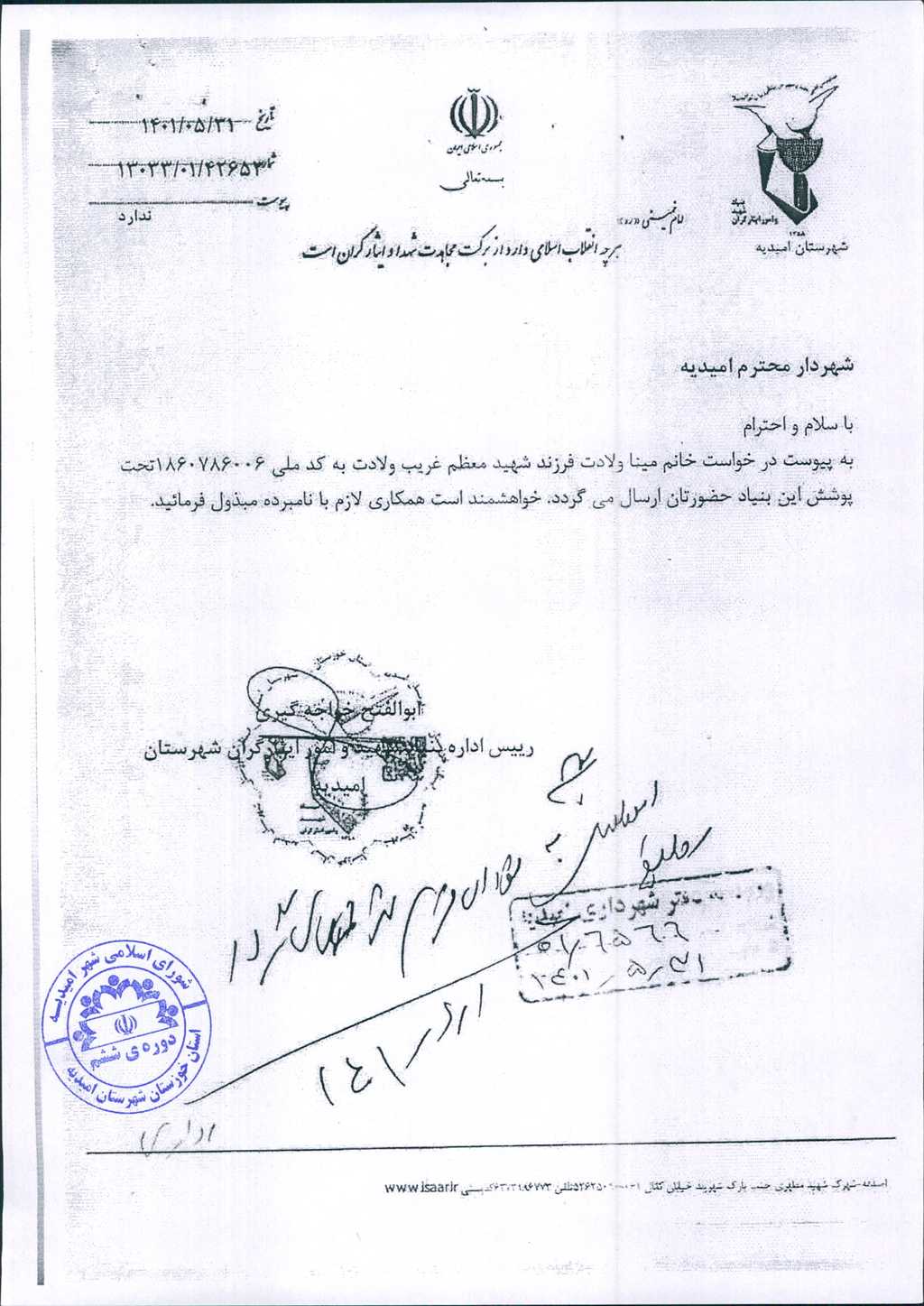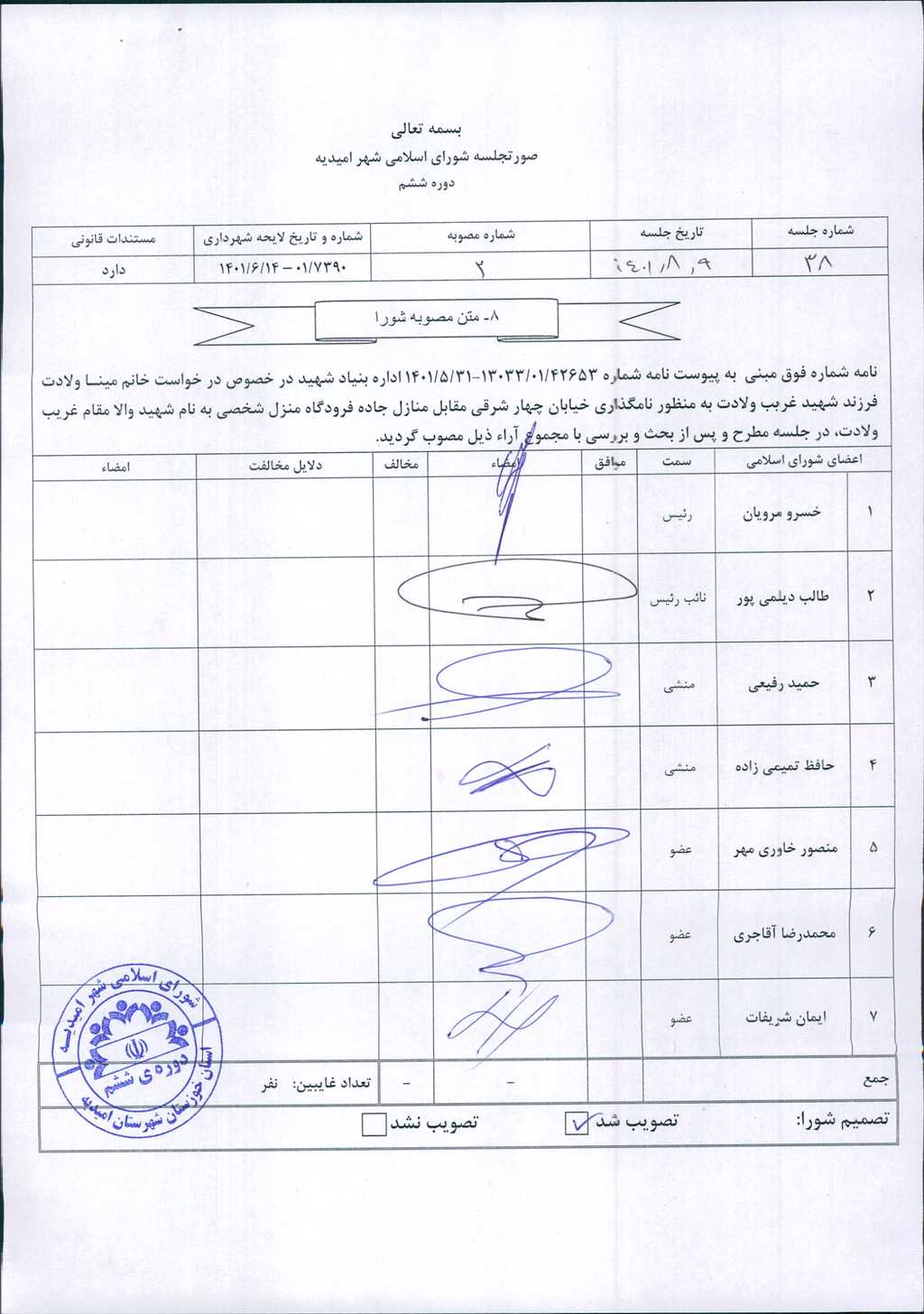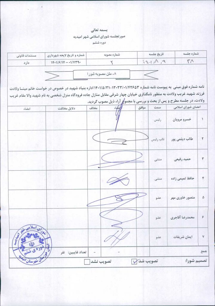نامه شماره فوق مبنی به پیوست نامه شماره ۴۲۶۵۳/ ۰۱/ ۱۳۰۳۳-۳۱/ ۵/ ۱۴۰۱ اداره بنیاد شهید در خصوص درخواست خانم مینا ولادت فرزند شهید غریب ولادت به منظور نامگذاری خیابان چهار شرقی مقابل منازل جاده فرودگاه منزل شخصی به نام شهید والا مقام غریب ولادت، در جلسه مطرح و پس از بحث و بررسی با مجموع آراء ذیل مصوب گردید.