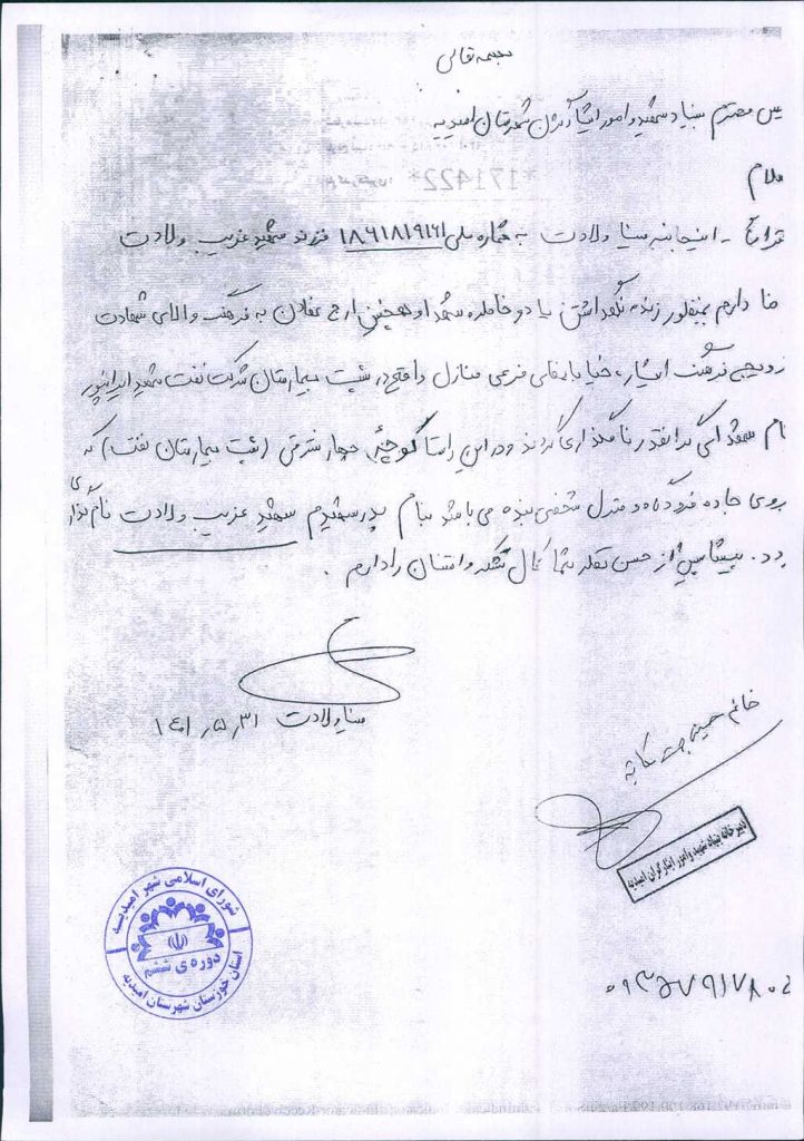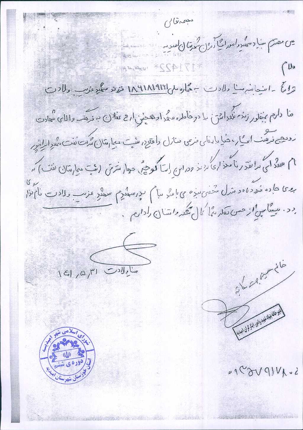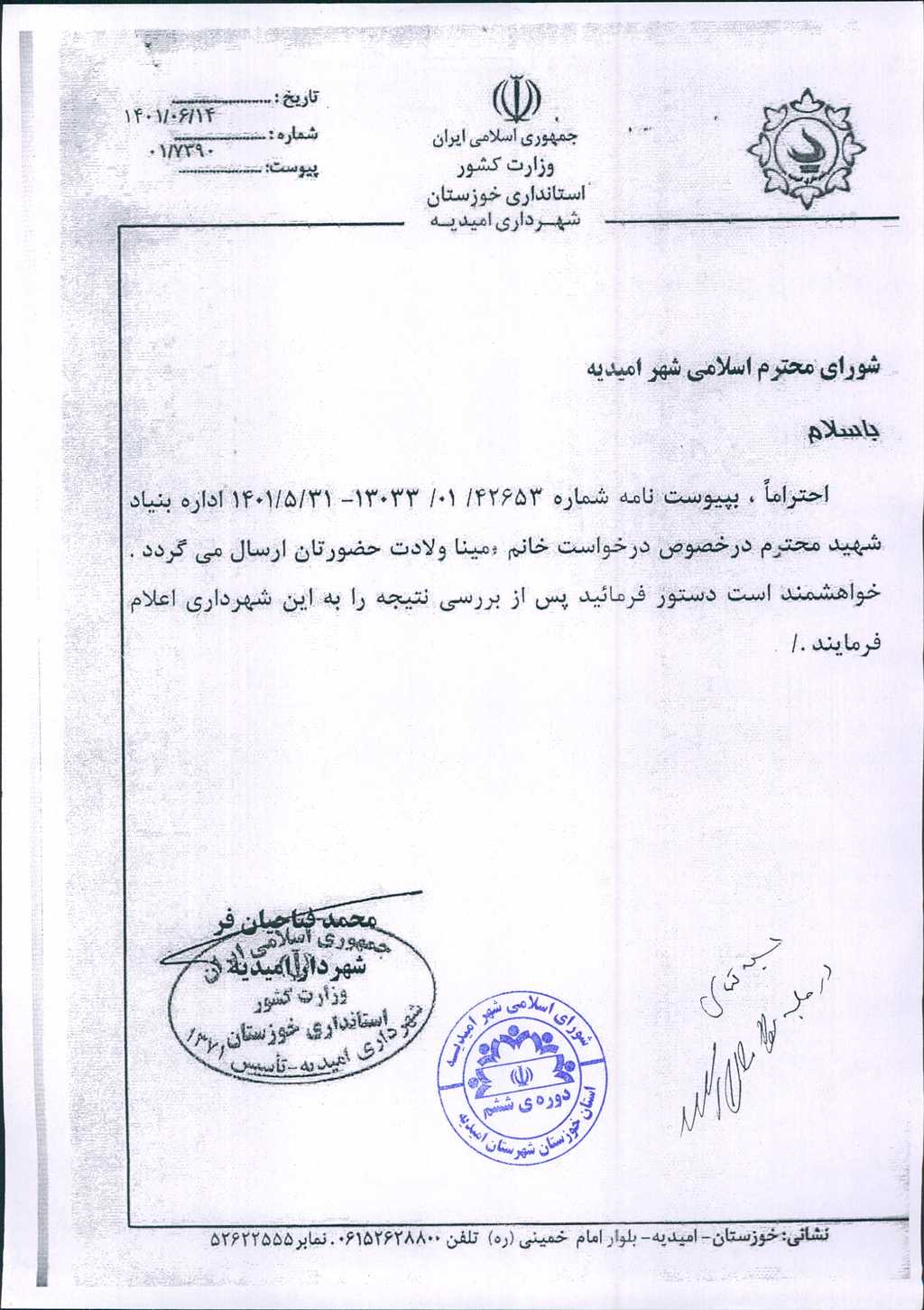 نامه شماره فوق مبنی به پیوست نامه شماره ۴۲۶۵۳/ ۰۱/ ۱۳۰۳۳-۳۱/ ۵/ ۱۴۰۱ اداره بنیاد شهید در خصوص درخواست خانم مینا ولادت فرزند شهید غریب ولادت به منظور نامگذاری خیابان چهار شرقی مقابل منازل جاده فرودگاه منزل شخصی به نام شهید والا مقام غریب ولادت، در جلسه مطرح و پس از بحث و بررسی با مجموع آراء ذیل مصوب گردید.