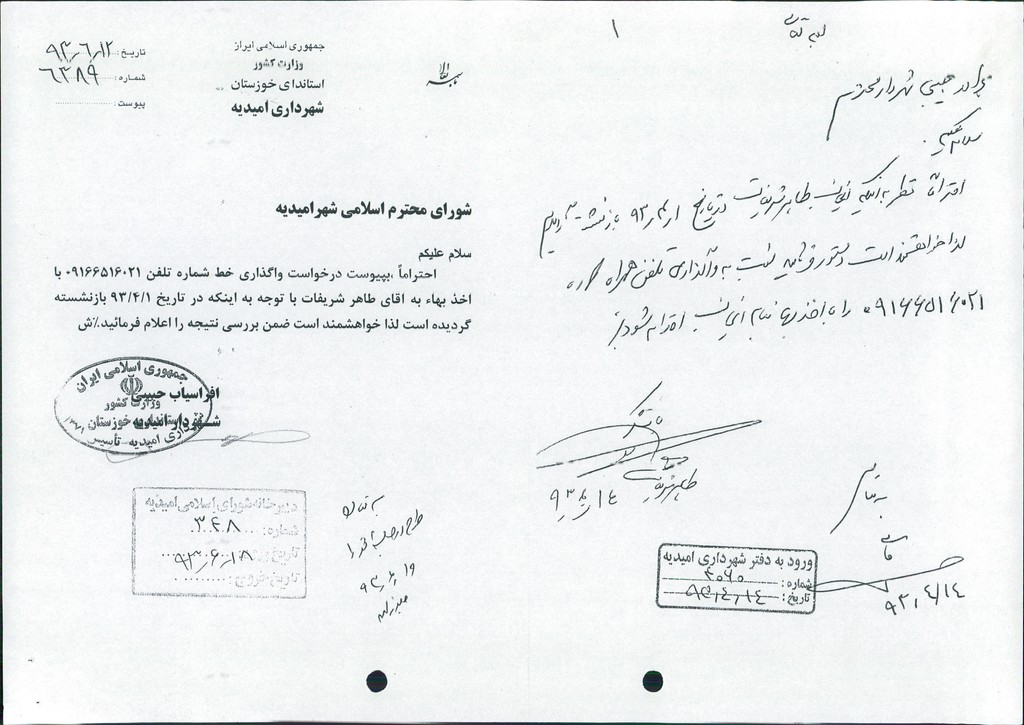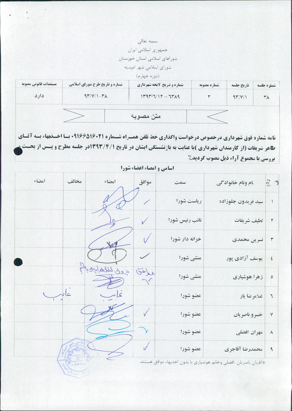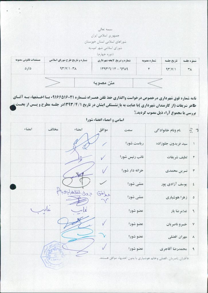 نامه شماره فوق شهرداری درخصوص درخواست واگذاری خط تلفن همراه شماره ۰۹۱۶۶۵۱۶۰۲۱ با اخذبهاء به آقای طاهر شریفات (از کارمندان شهرداری )با عنایت به بازنشستگی ایشان در تاریخ ۱/۴/۱۳۹۳در جلسه مطرح و پس از بحث و بررسی با مجموع آراء ذیل مصوب گردید%