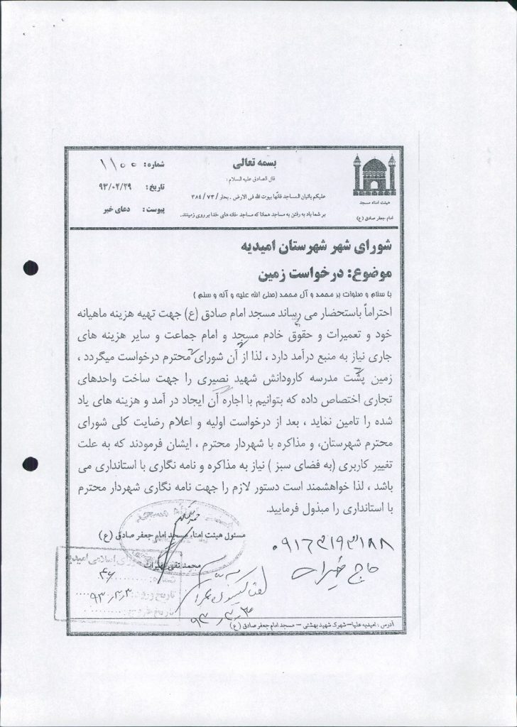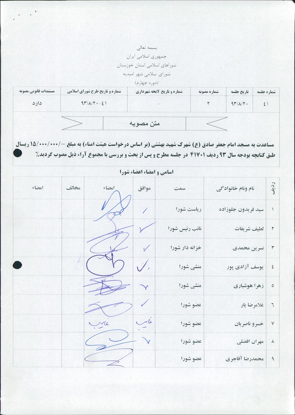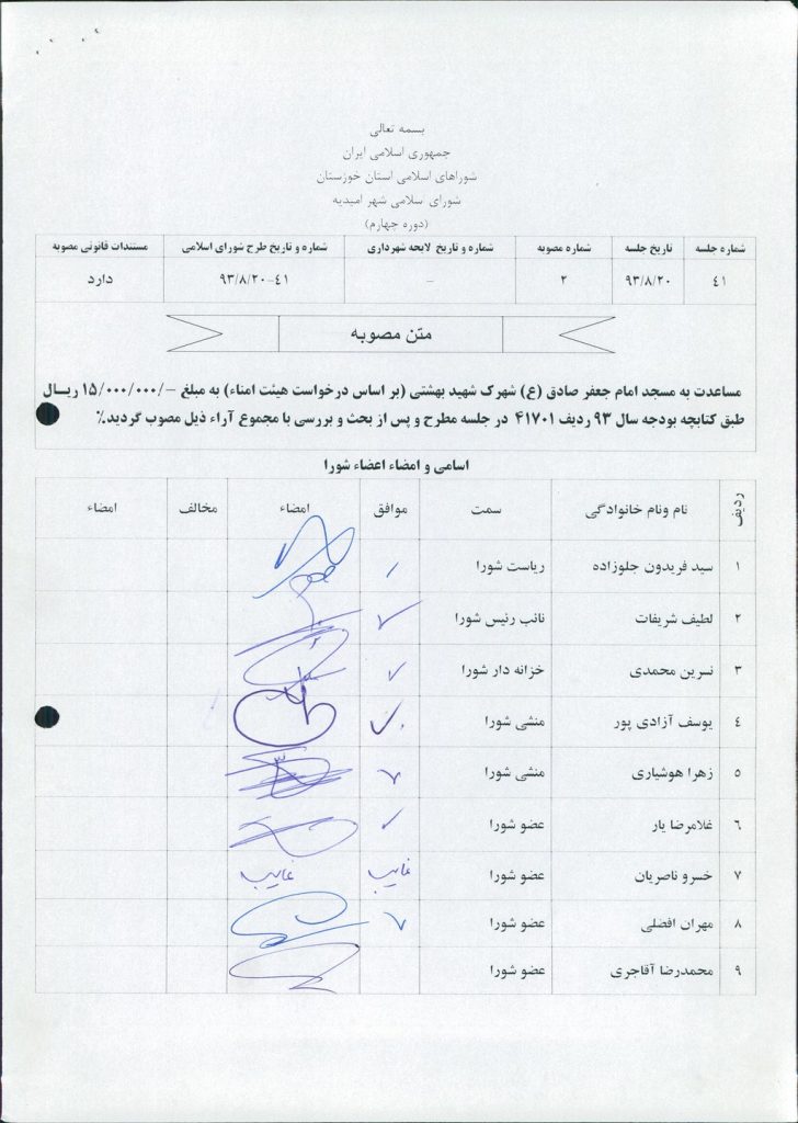 مساعدت به مسجد امام جعفر صادق (ع) شهرک شهید بهشتی (بر اساس درخواست هیئت امناء) به مبلغ ۱۵۰۰۰۰۰۰ ریال طبق کتابچه بودجه سال ۹۳ ردیف ۴۱۷۰۱ در جلسه مطرح و پس از بحث و بررسی با مجموع آراء ذیل مصوب گردید%