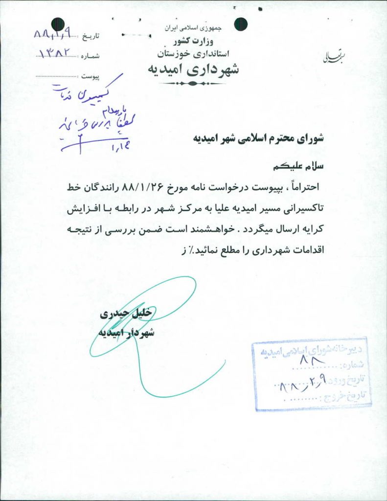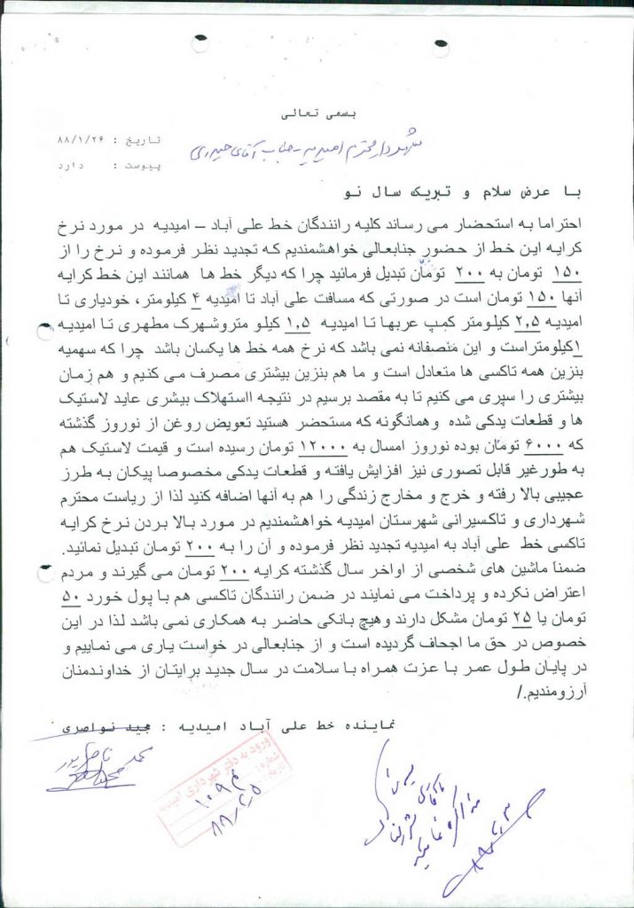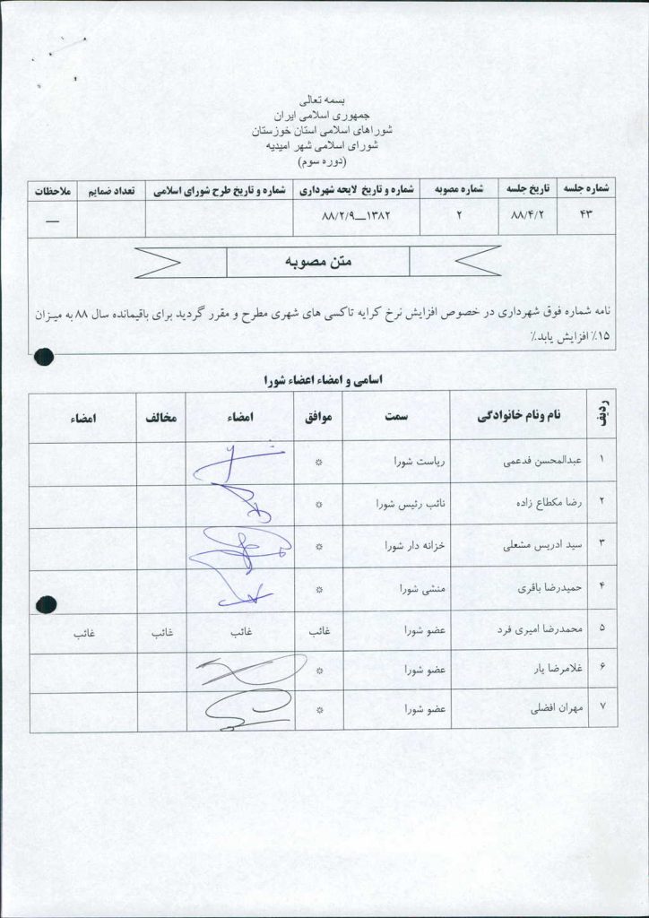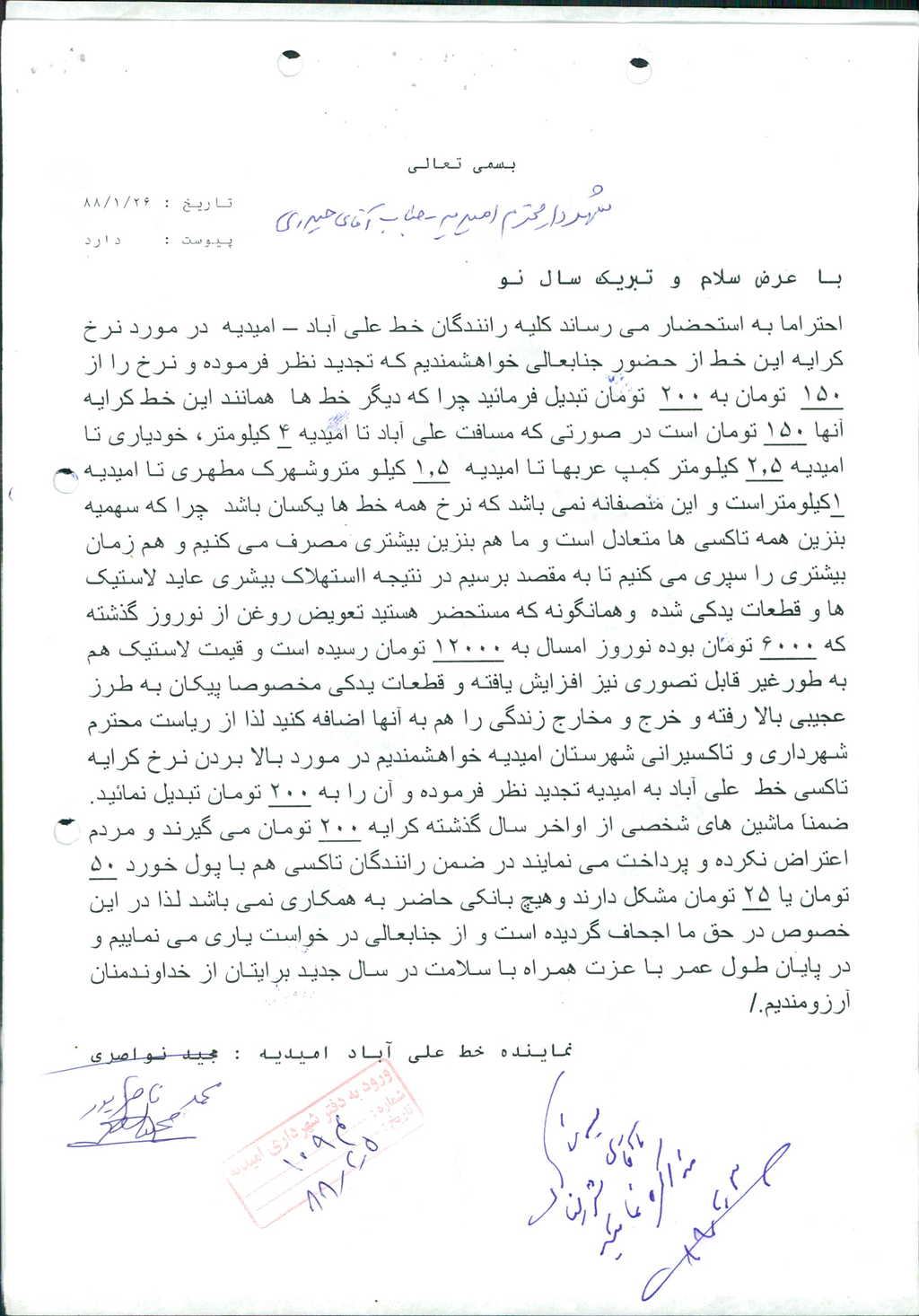 نامه شماره فوق شهرداری در خصوص افزایش نرخ کرایه تاکسی های شهری مطرح و مقرر گردید برای باقیمانده سال ۸۸ به میزان ۱۵% افزایش یابد%