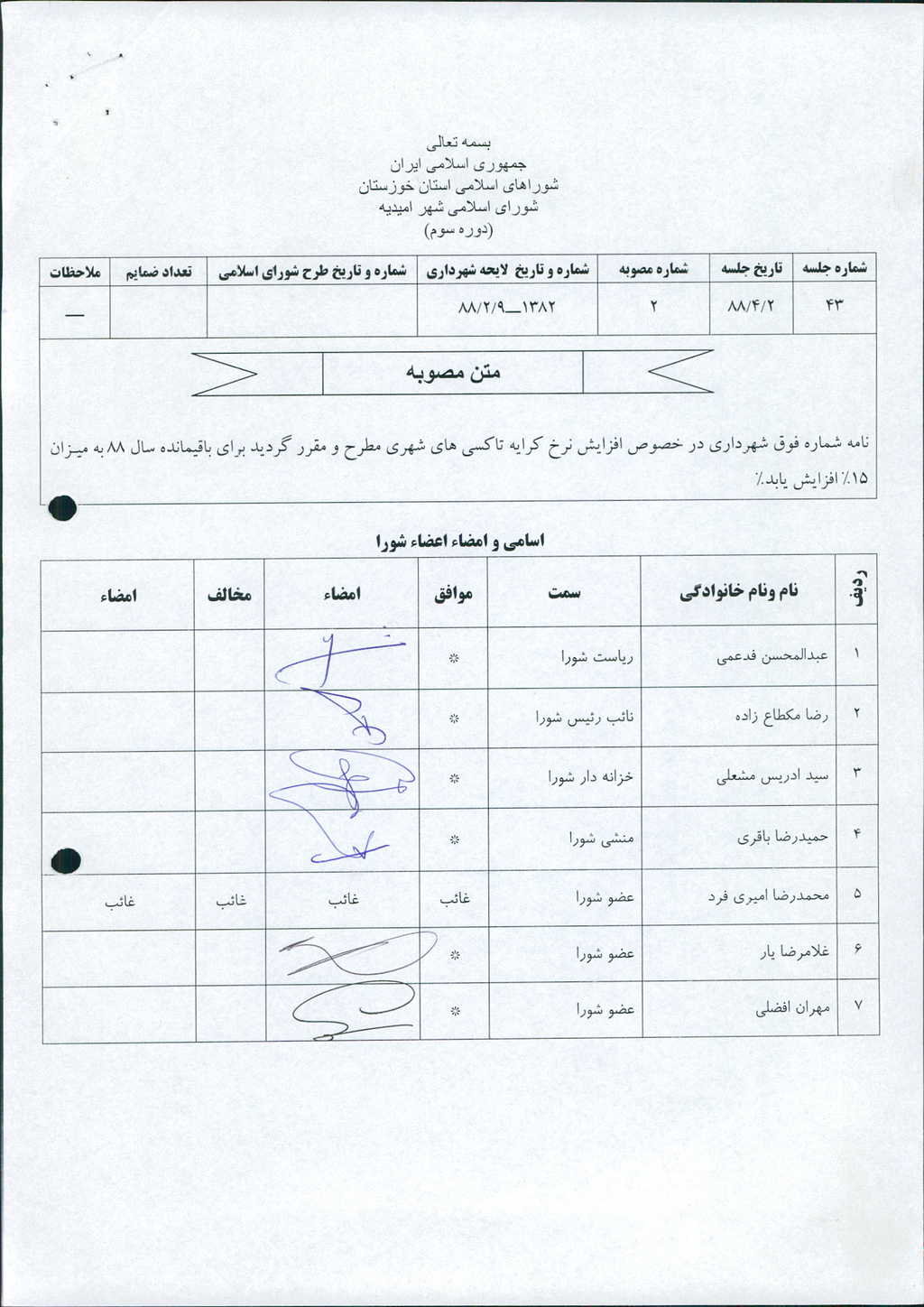 بسم الله الرحمن الرحیم مصوبه شماره ۲ جلسه شماره ۴۳ شورای اسلامی شهر امیدیه