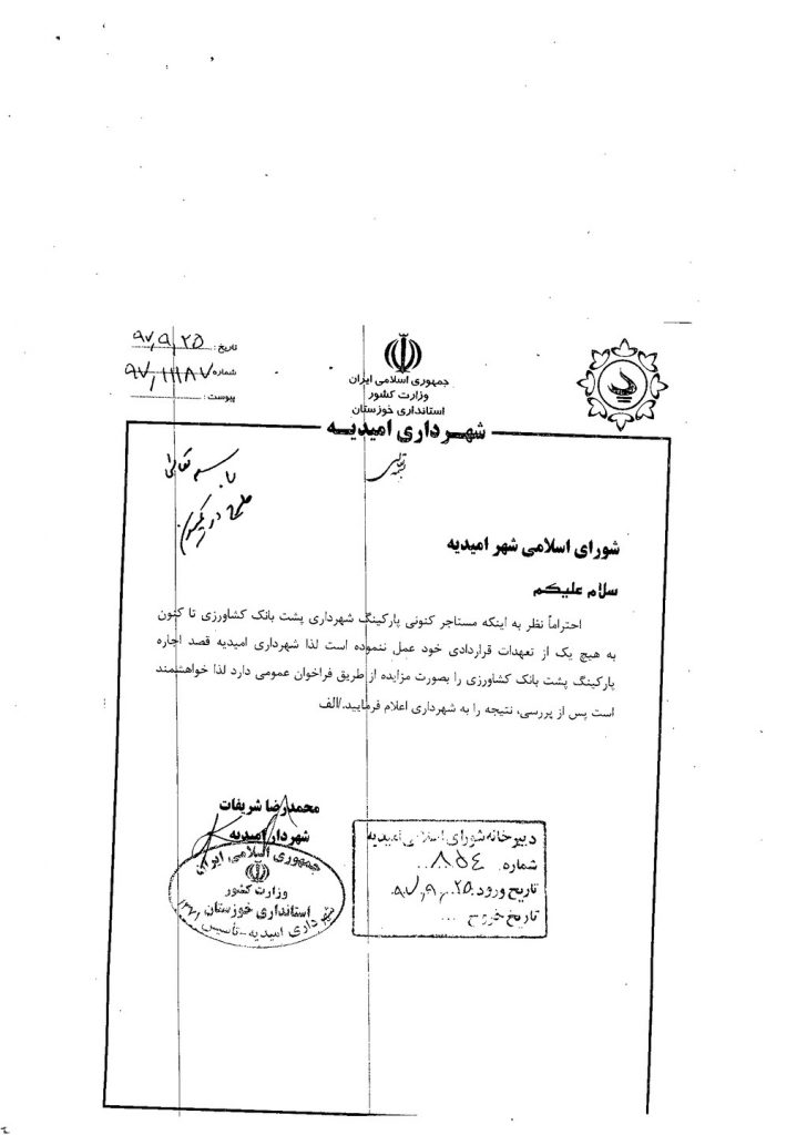 مصوبه شماره ۲ جلسه شماره ۴۸ مورخ ۹۷/۹/۲۷ شورای اسلامی شهر امیدیه