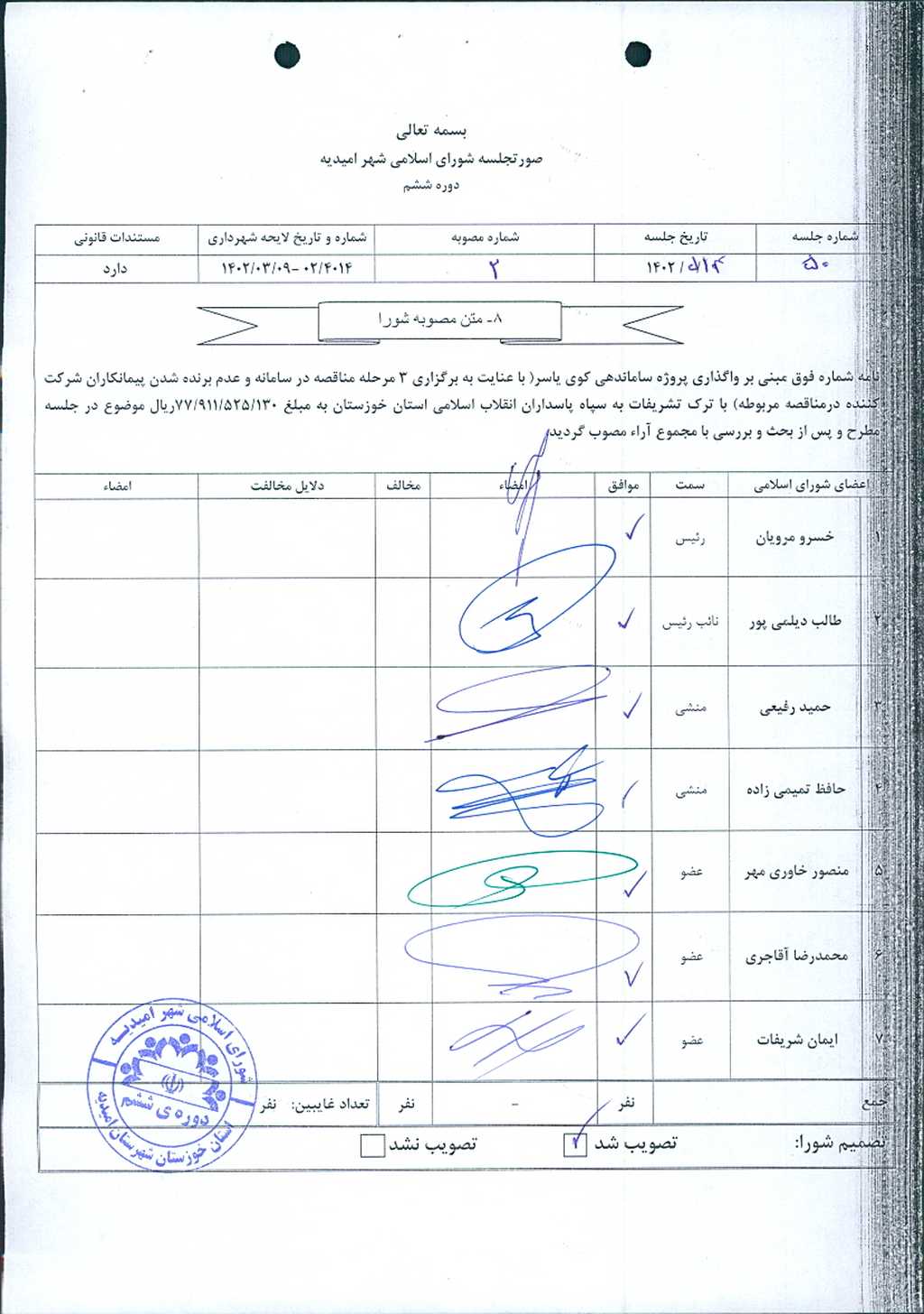 مصوبه شماره ۲ جلسه شماره ۵۰ شورای اسلامی شهر امیدیه