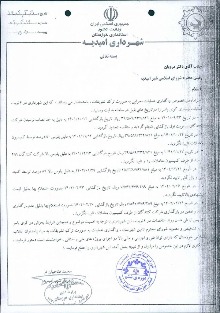 نامه شماره فوق مبنی بر واگذاری پروژه ساماندهی کوی یاسر( با عنایت به برگزاری ۳ مرحله مناقصه در سامانه و عدم برنده شدن پیمانکاران شرکت کننده درمناقصه مربوطه) با ترک تشریفات به سپاه پاسداران انقلاب اسلامی استان خوزستان به مبلغ ۱۳۰/ ۵۲۵/ ۹۱۱/ ۷۷ريال موضوع در جلسه مطرح و پس از بحث و بررسي با مجموع آراء مصوب گرديد.